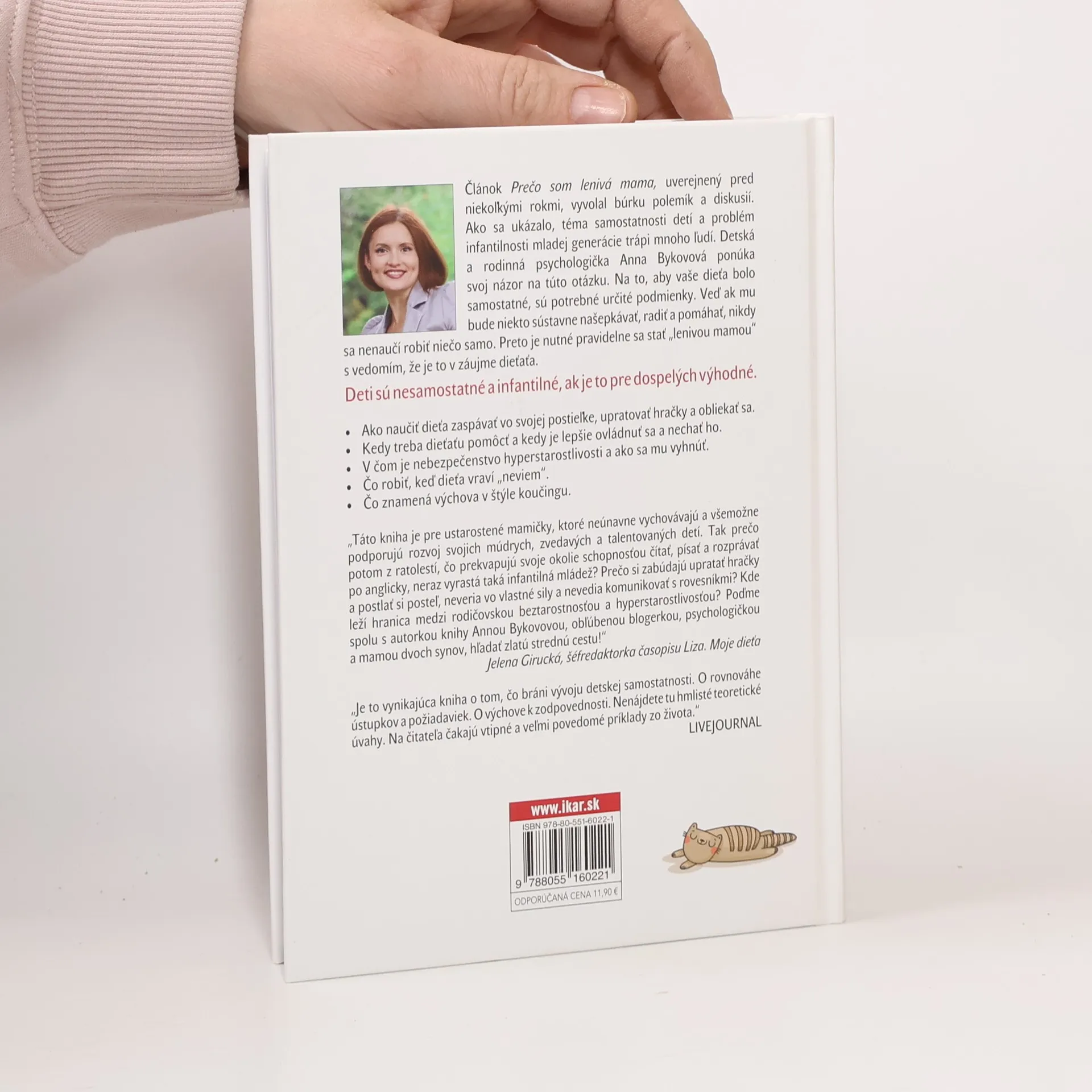 „Táto kniha je pre ustarostené mamičky, ktoré neúnavne vychovávajú a všemožne podporujú rozvoj svojich múdrych, zvedavých a talentovaných detí. Tak prečo potom z ratolestí, čo prekvapujú svoje okolie schopnosťou čítať, písať a rozprávať po anglicky, neraz vyrastá taká infantilná mládež? Prečo si zabúdajú upratať hračky a postlať si posteľ, neveria vo vlastné sily a nevedia komunikovať s rovesníkmi? Kde leží hranica medzi rodičovskou bezstarostnosťou a hyperstarostlivosťou? Poďme spolu s autorkou knihy Annou Bykovovou, obľúbenou blogerkou, psychologičkou a mamou dvoch synov, hľadať zlatú strednú cestu!“ Jelena Girucká, šéfredaktorka časopisu Liza. Moje dieťa