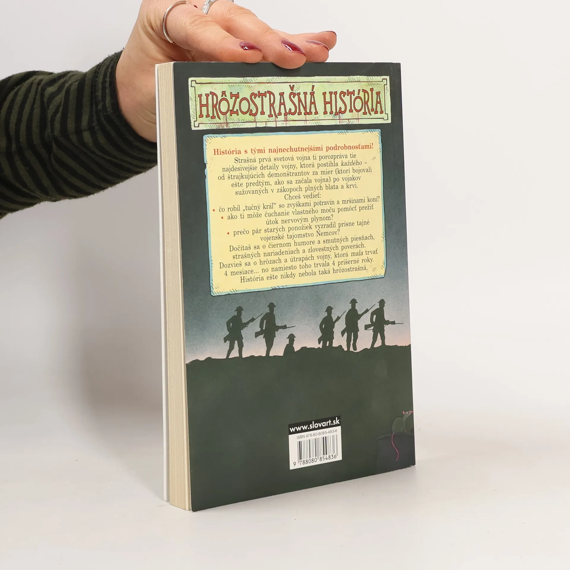 Strašná prvá svetová vojna vám porozpráva tie najstrašnejšie detaily hroznej vojny, ktorá postihla každého – od štrajkujúcich demonštrantov za mier (ktorí bojovali ešte predtým, ako sa začala vojna) po vojakov sužovaných v zákopoch plných blata a krvi. Dozviete sa čo robil „tučný kráľ“ so zvyškami potravín a mršinami koní, ako môže čuchanie vlastného moču pomôcť prežiť útok nervovým plynom, prečo pár starých ponožiek vyzradil prísne tajné vojenské tajomstvo Nemcov. Prečítate si o hrôzach a útrapách vojny, ktorá mala trvať 4 mesiace... no namiesto toho trvala 4 príšerné roky.