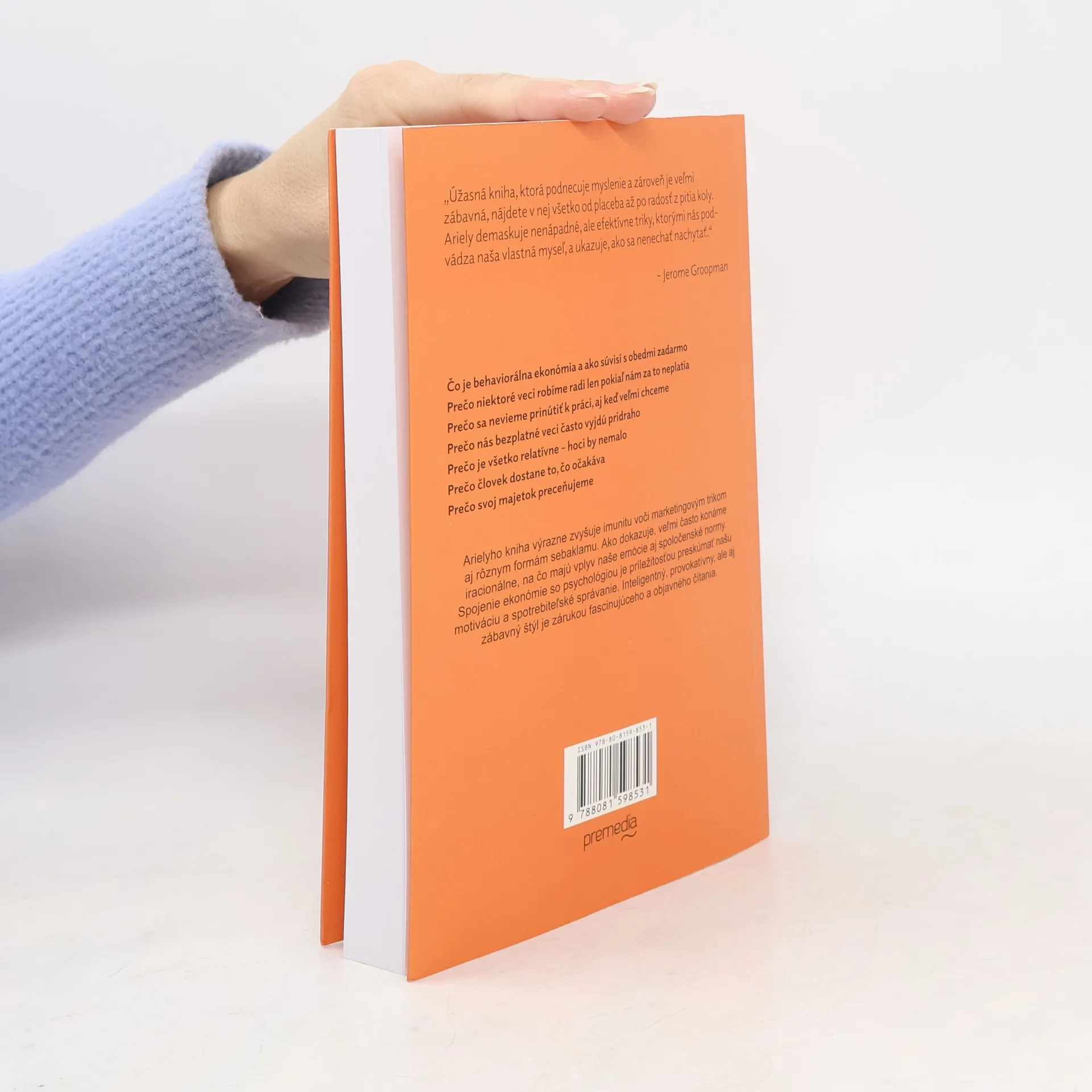 Skryté sily, ktoré ovplyvňujú naše rozhodnutia Zvykli sme si na predraženú kávu aj na predstavu o človeku ako racionálnej bytosti. Máme pocit, že drahší liek je účinnejší, šetríme na drobnostiach a rozhadzujeme pri dôležitých nákupoch. Po prečítaní Arielyho knihy to však už nemusí platiť. Výrazne zvyšuje imunitu voči marketingovým trikom aj rôznym formám sebaklamu. - Čo je behaviorálna ekonómia a ako súvisí s obedmi zadarmo - Prečo niektoré veci robíme radi len pokiaľ nám za to neplatia - Prečo sa nevieme prinútiť k práci, aj keď veľmi chceme - Prečo nás bezplatné veci často vyjdú pridraho - Prečo je všetko relatívne – hoci by nemalo - Prečo človek dostane to, čo očakáva - Prečo svoj majetok preceňujeme Ako dokazuje Dan Ariely, veľmi často konáme iracionálne, na čo majú vplyv naše emócie aj spoločenské normy. Spojenie ekonómie so psychológiou je príležitosťou preskúmať našu motiváciu a spotrebiteľské správanie, ale aj ekonomickú a vzdelávaciu politiku. Arielyho inteligentný, provokatívny, ale aj zábavný štýl je zárukou fascinujúceho a objavného čítania.