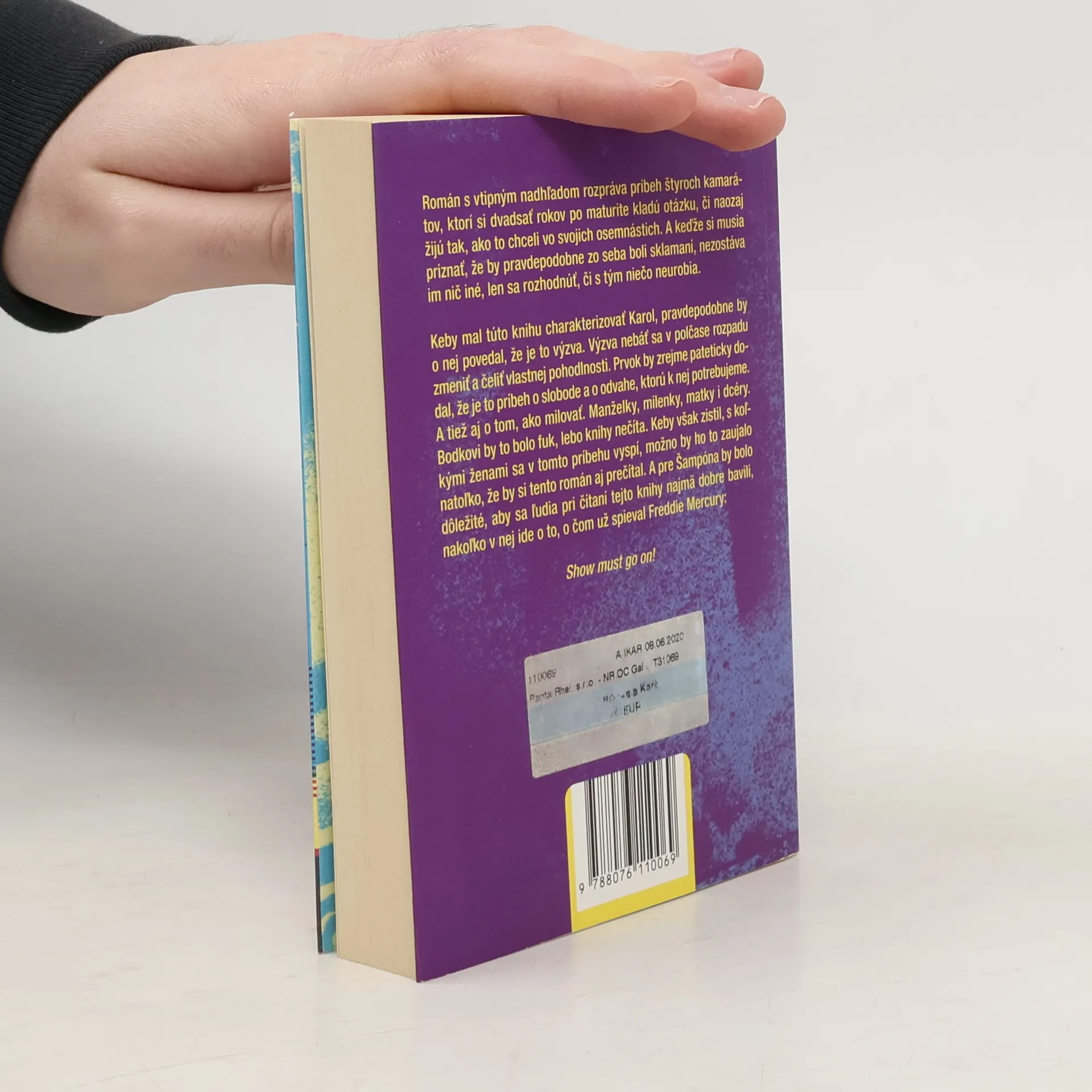 Román s vtipným nadhľadom rozpráva príbeh štyroch kamarátov, ktorí si dvadsať rokov po maturite kladú otázku, či naozaj žijú tak, ako to chceli vo svojich osemnástich. A keďže si musia priznať, že by pravdepodobne zo seba boli sklamaní, nezostáva im nič iné, len sa rozhodnúť, či s tým niečo neurobia. Keby mal túto knihu charakterizovať Karol, pravdepodobne by o nej povedal, že je to výzva. Výzva nebáť sa v polčase rozpadu zmeniť a čeliť vlastnej pohodlnosti. Prvok by zrejme pateticky dodal, že je to príbeh o slobode a o odvahe, ktorú k nej potrebujeme. A tiež aj o tom, ako milovať. Manželky, milenky, matky i dcéry. Bodkovi by to bolo fuk, lebo knihy nečíta. Keby však zistil, s koľkými ženami sa v tomto príbehu vyspí, možno by ho to zaujalo natoľko, že by si tento román aj prečítal. A pre Šampóna by bolo dôležité, aby sa ľudia pri čítaní tejto knihy najmä dobre bavili, nakoľko v nej ide o to, o čom už spieval Freddie Mercury: Show must go on!