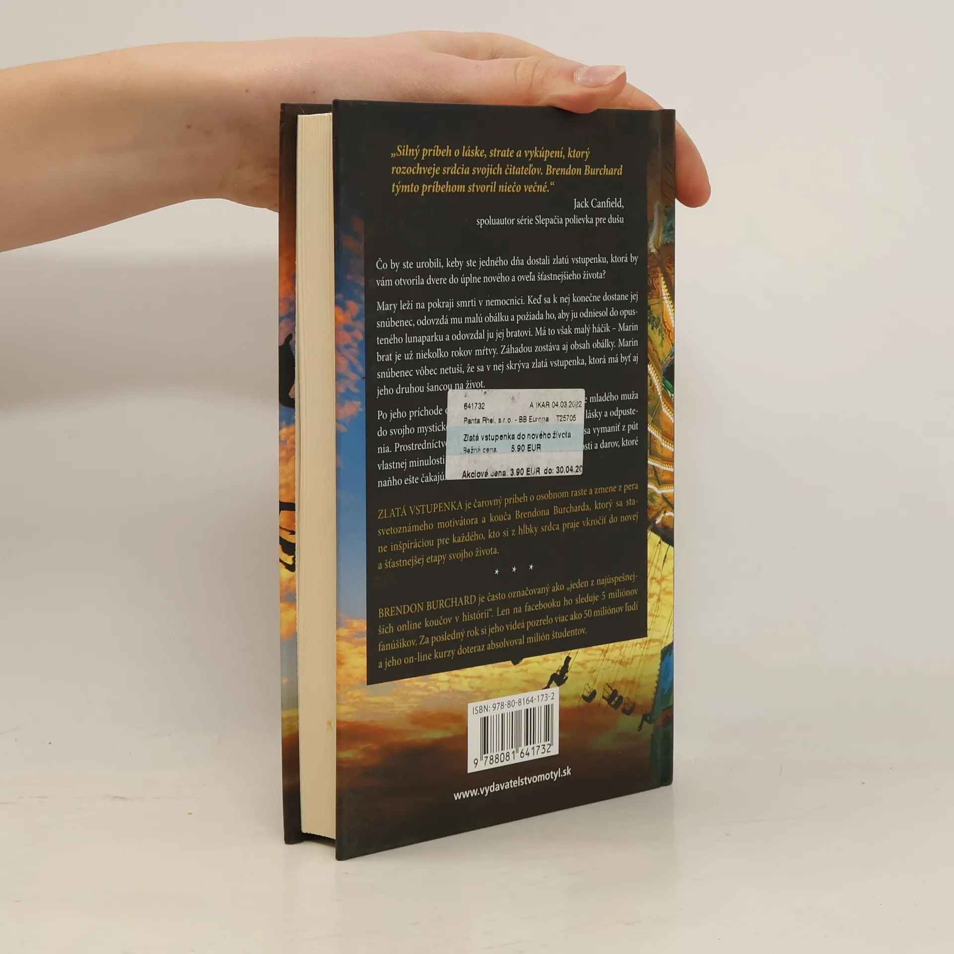 Čarovný príbeh od svetovo najúspešnejšieho motivátora a kouča, v ktorom sila lásky otvára dvere do šťastnej budúcnosti Čo by ste urobili, keby ste jedného dňa dostali zlatú vstupenku, ktorá by vám otvorila dvere do úplne nového a oveľa šťastnejšieho života? Po jeho príchode opustený lunapark zrazu ožíva a vťahuje mladého muža do svojho mystického sveta kúzel, zabudnutých príbehov, lásky a odpustenia. Prostredníctvom tajuplných postáv mu ukazuje, ako sa vymaniť z pút vlastnej minulosti tak, aby bol schopný tešiť sa z prítomnosti a darov, ktoré naňho ešte čakajú. Zlatá vstupenkaje čarovný príbeh o osobnom raste a zmene z pera svetoznámeho motivátora a kouča Brendona Burcharda, ktorý sa stane inšpiráciou pre každého, kto si z hĺbky srdca praje vkročiť do novej a šťastnejšej etapy svojho života.