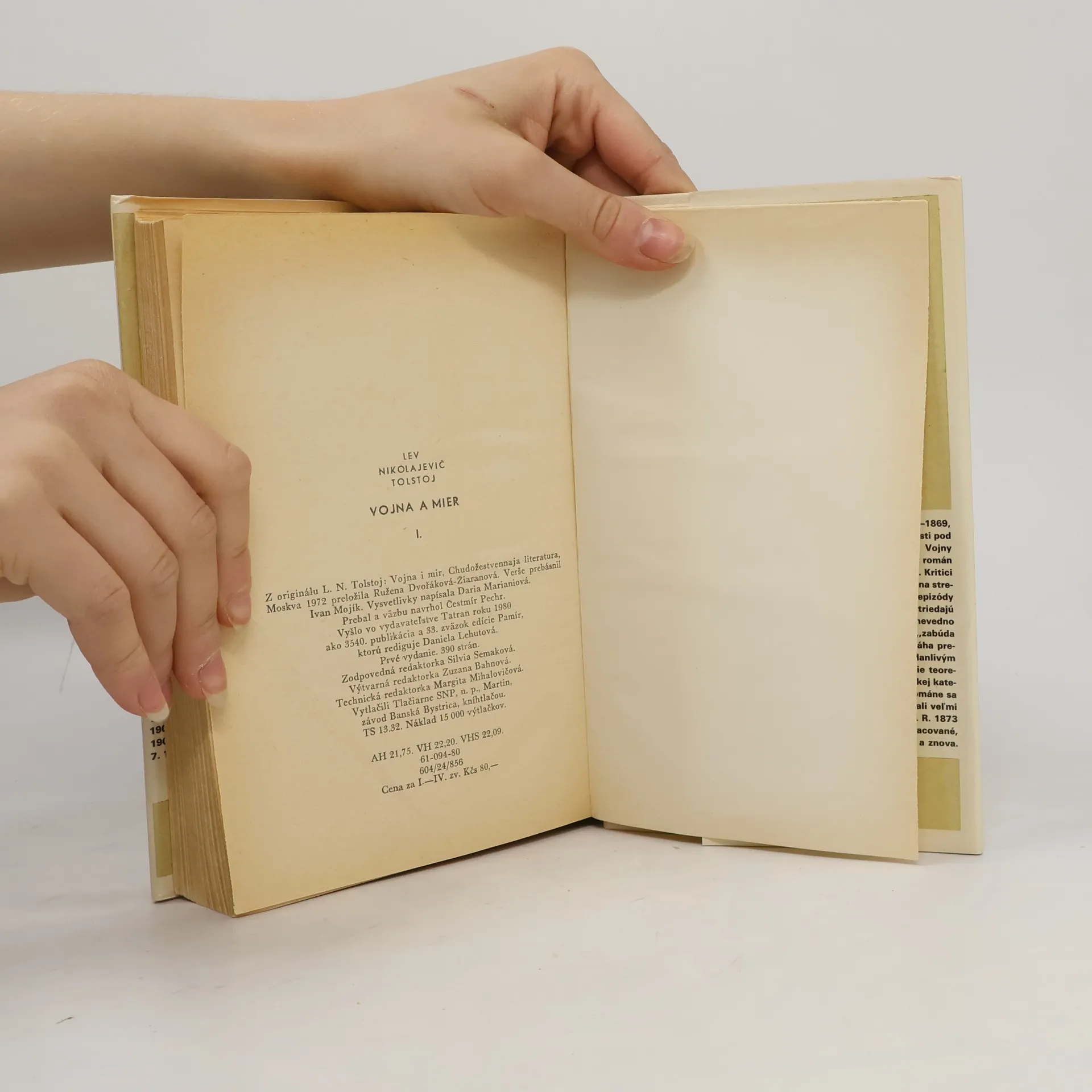 Vojna a mier je štvordielna epopeja zobrazujúca ruskú spoločnosť v prvej tretine 19. storočia. Román má tri roviny: historickú, osobnú a filozofickú. Na pozadí obdobia napoleonských vojen a tesne po ňom sa stretávame so skutočnými historickými postavami i postavami čisto literárnymi, ktoré ale odrážajú živé ľudské vzory. Na veľkom priestore, spôsobom pásma, pri striedaní období vojny a mieru sa odohrávajú osudy viac ako 250 postáv, hlavných i epizódnych. Čitateľ sa ocitne v šľachtických salónoch Moskvy, Petrohradu, vidieckych panských sídlach i na bojiskách s veľkolepými opismi bitiek. 61-094-80