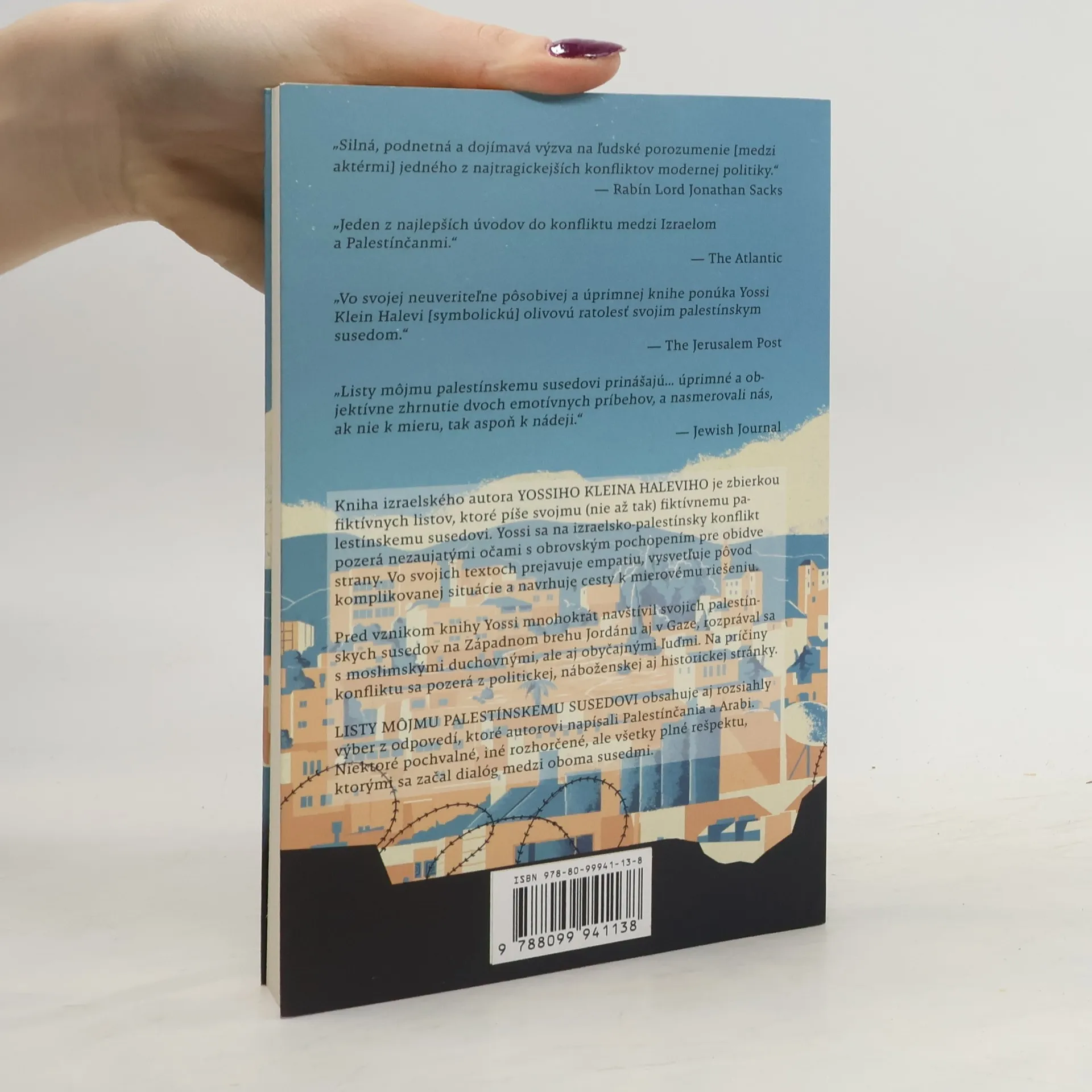 Kniha izraelského autora YOSSIHO KLEINA HALEVIHO je zbierkou fiktívnych listov, ktoré píše svojmu (nie až tak) fiktívnemu palestínskemu susedovi. Yossi sa na izraelsko-palestínsky konflikt pozerá nezaujatými očami s obrovským pochopením pre obidve strany. Vo svojich textoch prejavuje empatiu, vysvetľuje pôvod komplikovanej situácie a navrhuje cesty k mierovému riešeniu. Pred vznikom knihy Yossi mnohokrát navštívil svojich palestínskych susedov na Západnom brehu Jordánu aj v Gaze, rozprával sa s moslimskými duchovnými, ale aj obyčajnými ľuďmi. Na príčiny konfliktu sa pozerá z politickej, náboženskej aj historickej stránky. LISTY MÔJMU PALESTÍNSKEMU SUSEDOVI obsahuje aj rozsiahly výber z odpovedí, ktoré autorovi napísali Palestínčania a Arabi. Niektoré pochvalné, iné rozhorčené, ale všetky plné rešpektu, ktorými sa začal dialóg medzi oboma susedmi.