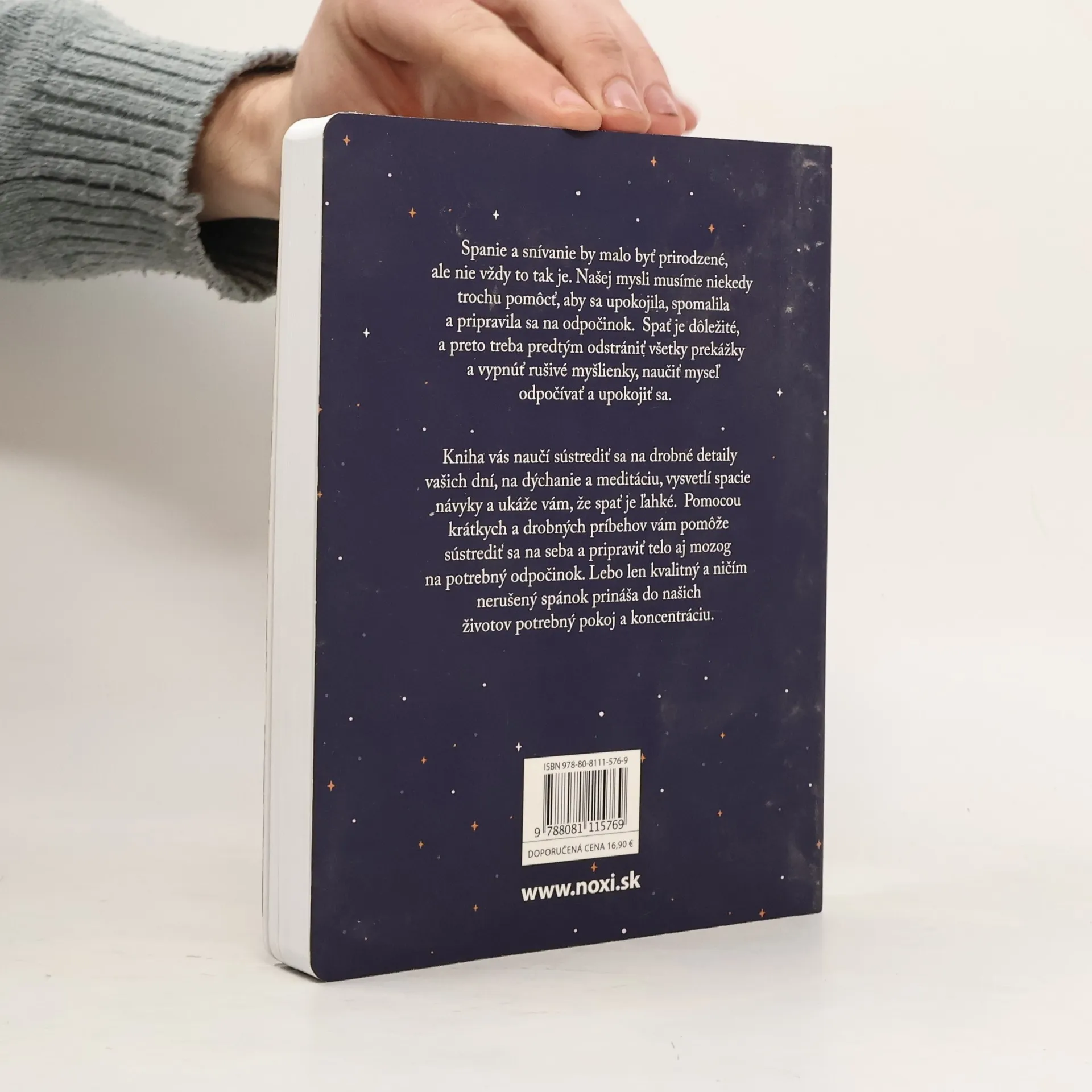Spanie a snívanie by malo byť prirodzené, ale nie vždy to tak je. Našej mysli musíme niekedy trochu pomôcť, aby sa upokojila, spomalila a pripravila sa na odpočinok. Spať je dôležité, a preto treba predtým odstrániť všetky prekážky a vypnúť rušivé myšlienky, naučiť myseľ odpočívať a upokojiť sa. Kniha vás naučí sústrediť sa na drobné detaily vašich dní, na dýchanie a meditáciu, vysvetlí spacie návyky a ukáže vám, že spať je ľahké. Pomocou krátkych a drobných príbehov vám pomôže sústrediť sa na seba a pripraviť telo aj mozog na potrebný odpočinok. Lebo len kvalitný a ničím nerušený spánok prináša do našich životov potrebný pokoj a koncentráciu.