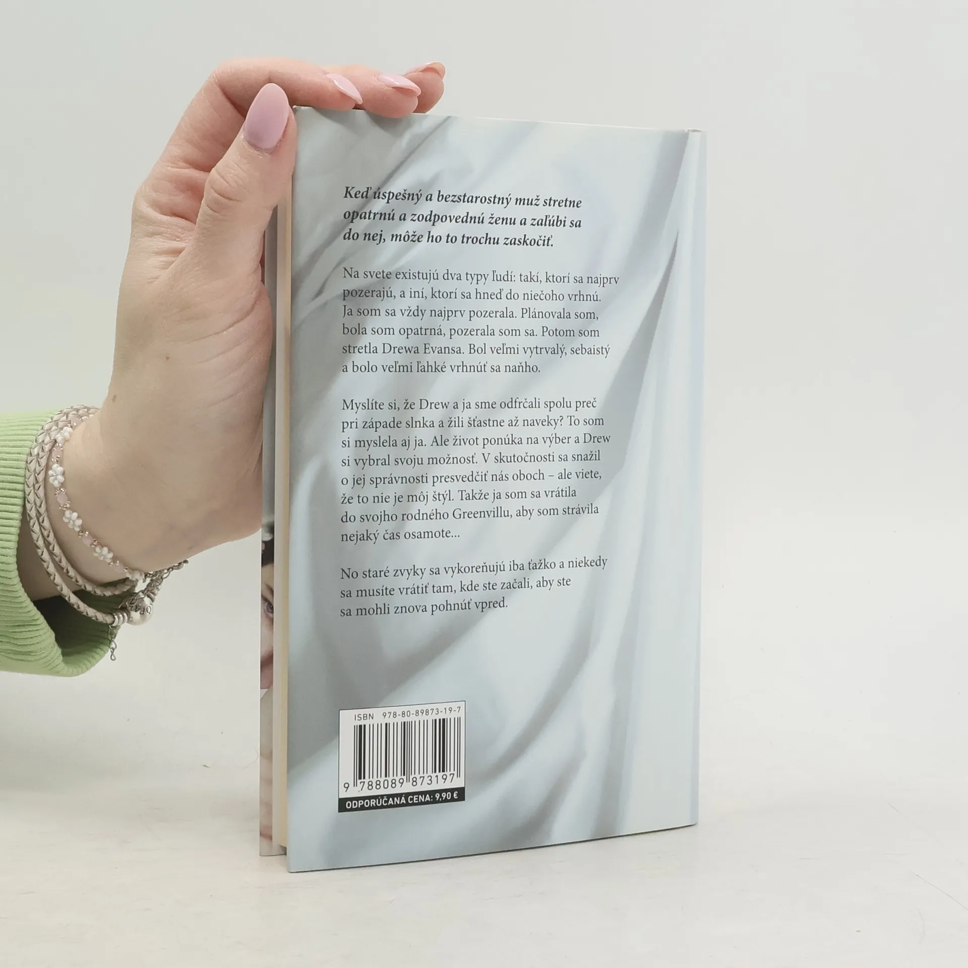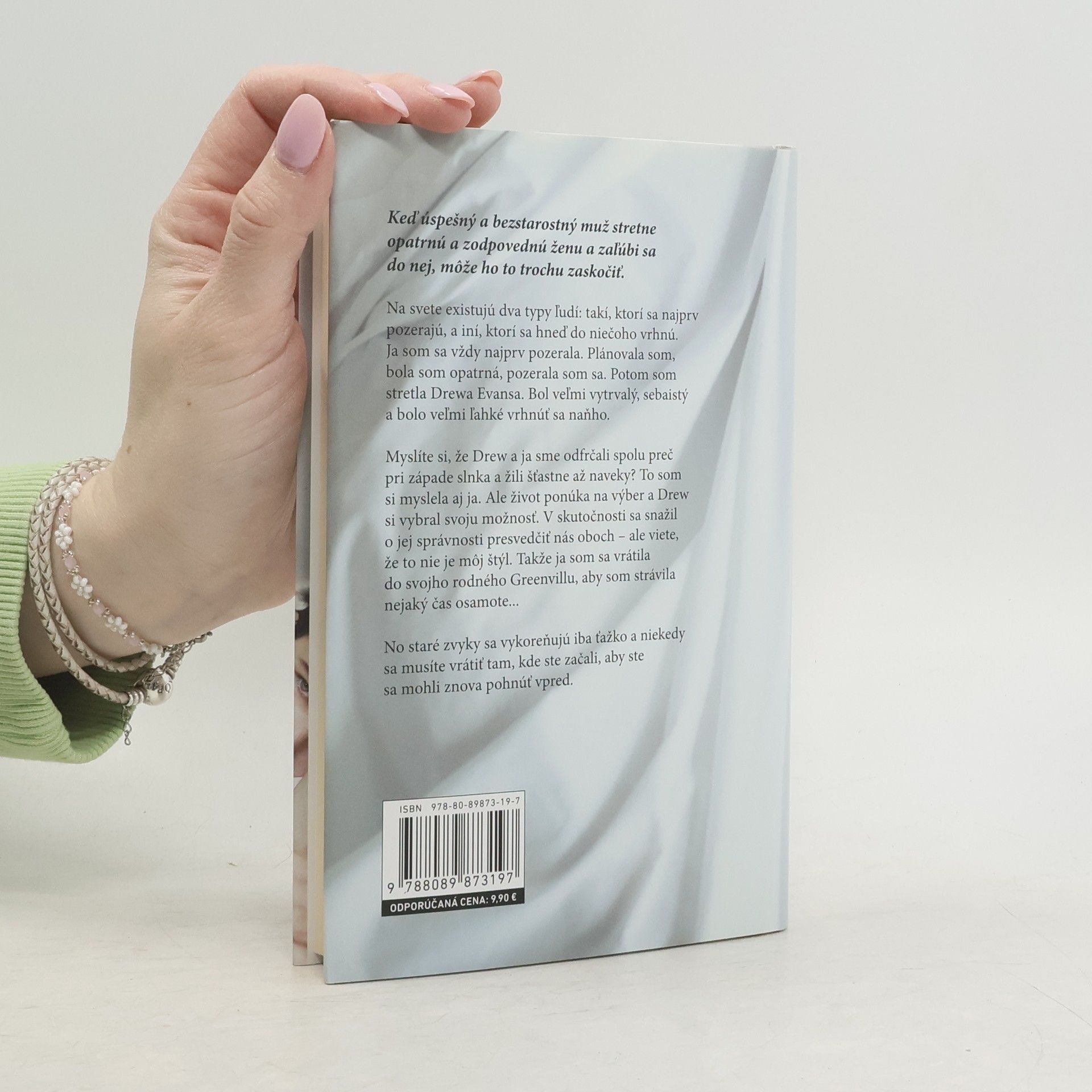 Keď úspešny´ a bezstarostny´ muž stretne opatrnú a zodpovednú ženu a zaľúbi sa do nej, môže ho to trochu zaskočiť. Na svete existujú dva typy ľudí: takí, ktorí sa najprv pozerajú, a iní, ktorí sa hneď do niečoho vrhnú. Ja som sa vždy najprv pozerala. Plánovala som, bola som opatrná, pozerala som sa. Potom som stretla Drewa Evansa. Bol veľmi vytrvaly´, sebaisty´ a bolo veľmi ľahké vrhnúť sa naňho. Myslíte si, že Drew a ja sme odfrčali spolu preč pri západe slnka a žili šťastne až naveky? To som si myslela aj ja. Ale život ponúka na vy´ber a Drew si vybral svoju možnosť. V skutočnosti sa snažil o jej správnosti presvedčiť nás oboch – ale viete, že to nie je môj šty´l. Takže ja som sa vrátila do svojho rodného Greenvillu, aby som strávila nejaky´ čas osamote… No staré zvyky sa vykoreňujú iba ťažko a niekedy sa musíte vrátiť tam, kde ste začali, aby ste sa mohli znova pohnúť vpred.