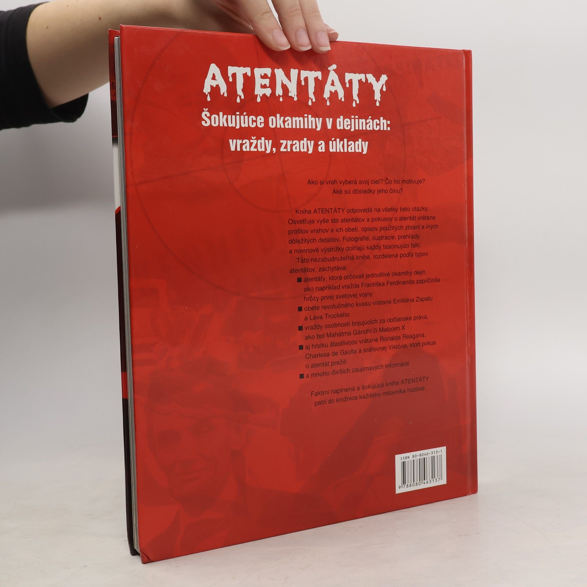 Táto faktami naplnená kniha patrí do knižnice každého milovníka histórie. Osvetľuje vyše sto atentátov a pokusov o atentát vrátane profilov vrahov a ich obetí, opisov použitých zbraní atď. Zachytáva atentáty, ktoré ovplyvnili chod dejín, ako napríklad vražda Františka Ferdinanda, obete revolúcií, vraždy ľudí bojujúcich za občianske práva, ako bol Mahátma Gándhí, aj šťastie tých, ktorí pokus o atentát prežili. Fotografie, ilustrácie, mapy a novinové výstrižky dopĺňajú každý fascinujúci fakt.
