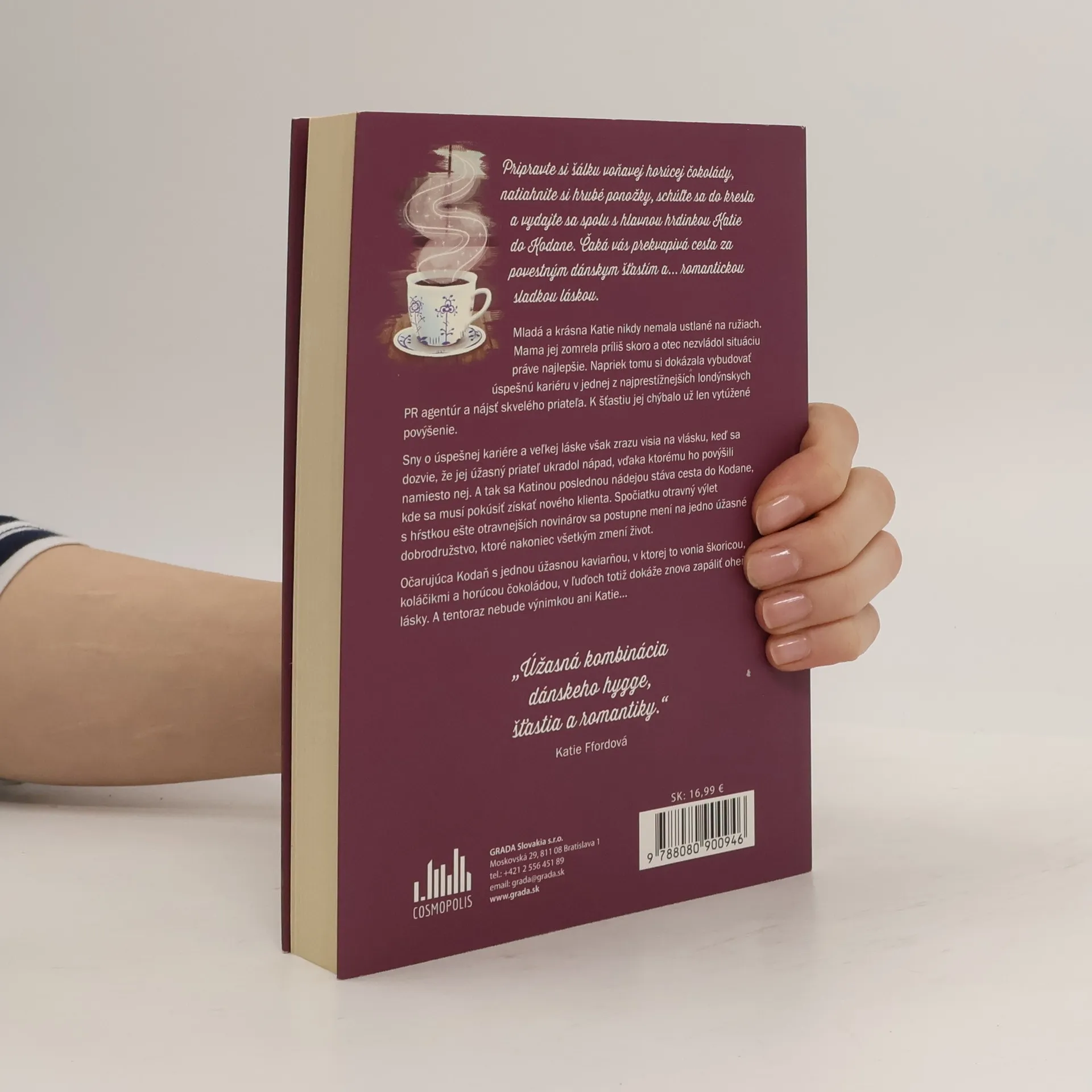 Pripravte si šálku voňavej horúcej čokolády, natiahnite si hrubé ponožky, schúľte sa do kresla a vydajte sa spolu s hlavnou hrdinkou Katie do Kodane. Čaká vás prekvapivá cesta za povestným dánskym šťastím a. .. romantickou sladkou láskou. Mladá a krásna Katie nikdy nemala ustlané na ružiach. Mama jej zomrela príliš skoro a otec nezvládol situáciu práve najlepšie. Napriek tomu si dokázala vybudovať úspešnú kariéru v jednej z najprestížnejších londýnskych PR agentúr a nájsť skvelého priateľa. K šťastiu jej chýbalo už len vytúžené povýšenie. Sny o úspešnej kariére a veľkej láske však zrazu visia na vlásku, keď sa dozvie, že jej úžasný priateľ ukradol nápad, vďaka ktorému ho povýšili namiesto nej. A tak sa Katinou poslednou nádejou stáva cesta do Kodane, kde sa musí pokúsiť získať nového klienta. Spočiatku otravný výlet s hŕstkou ešte otravnejších novinárov sa postupne mení na jedno úžasne dobrodružstvo, ktoré nakoniec všetkým zmení život. Očarujúca Kodaň s jednou úžasnou kaviarňou, v ktorej to vonia škoricou, koláčikmi a horúcou čokoládou, v ľuďoch totiž dokáže znova zapáliť oheň lásky. A tentoraz nebude výnimkou ani Katie. ..