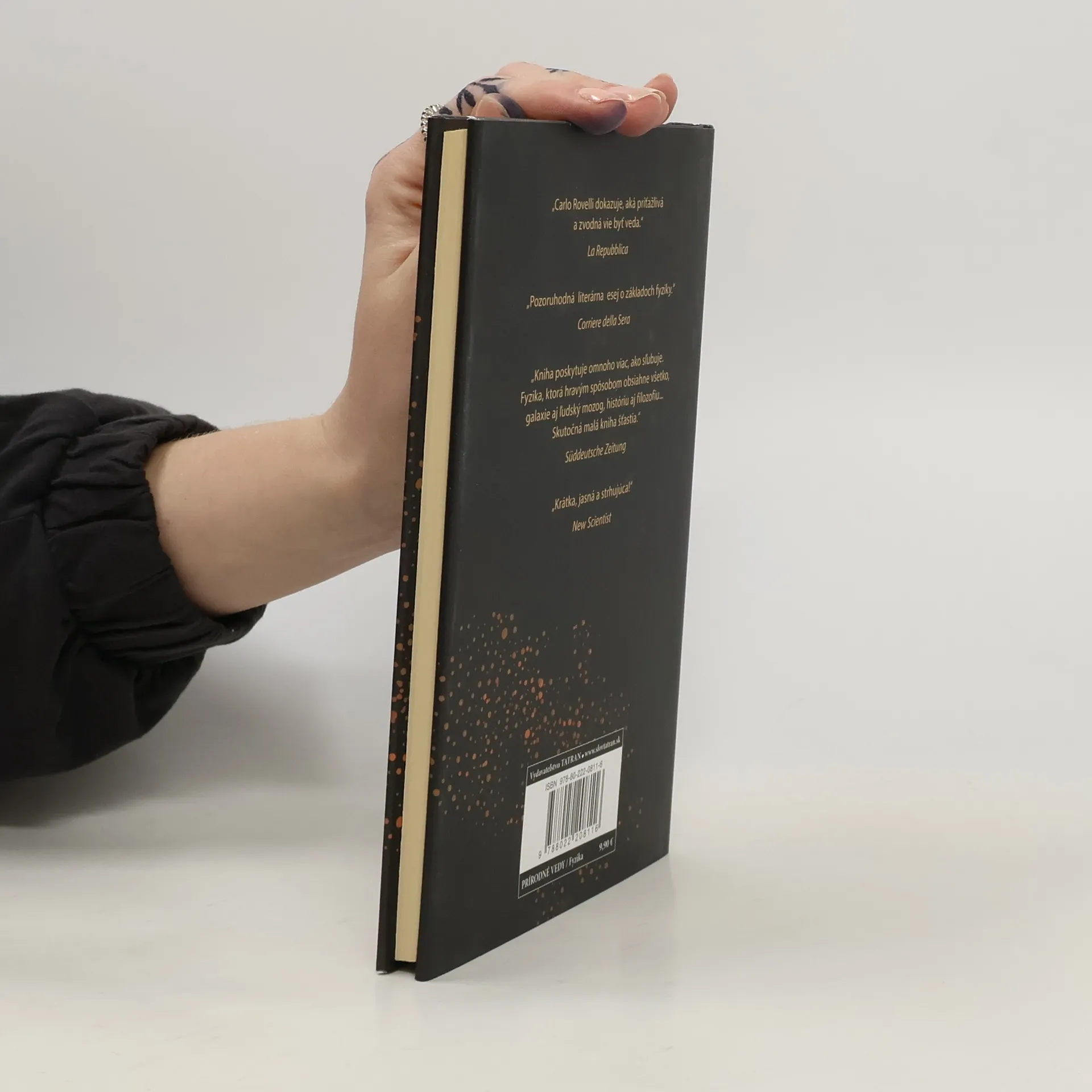 Jednoduché, zrozumiteľné a obdivuhodné. To je stručná charakteristika Rovelliho diela, ktoré bolo preložené do viac ako štyridsiatich jazykov. Keď autorovi ponúkli priestor v nedeľnej prílohe denníka Sole 24 Ore, dokonale ho využil. Pritiahol desaťtisíce čitateľov a zdôraznil plnohodnotnú a životne dôležitú úlohu, akú zohráva fyzika v kultúre spoločnosti. Autor vo svojich prednáškach berie zreteľ na laického čitateľa a približuje mu teóriu relativity alebo kvantovú mechaniku spôsobom, akoby rozoberal divadelnú hru. A divadlo vesmíru je v jeho podaní nesmierne okúzľujúce! Fyzika otvára okná, z ktorých sa dá dovidieť ďaleko. To, čo vidíme, nás privádza do úžasu. Zisťujeme, že sme plní predsudkov a náš intuitívny obraz sveta je čiastočný, úzkoprsý, neúplný. Vždy keď sa dozvedáme niečo nové, svet sa nám začína meniť pred očami. V nesmiernom mori galaxií a hviezd sme iba strateným kútikom, v nekonečných ornamnetoch, ktoré tvoria plátno skutočnosti, sme iba jednou z drobných čiaročiek.