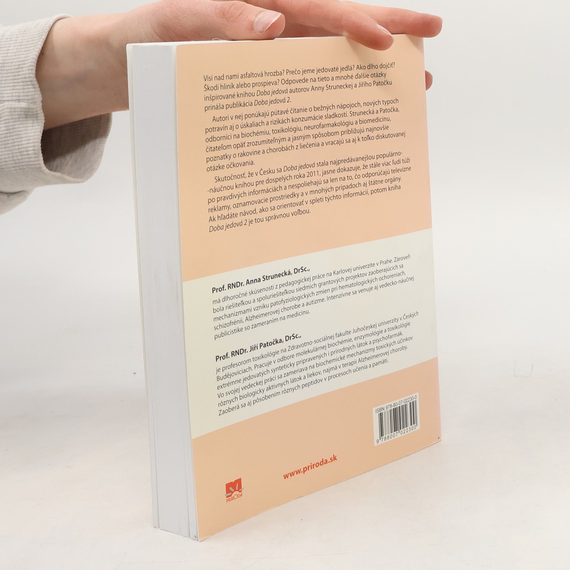 Visí nad nami azbestová hrozba? Prečo jeme jedovaté jedlá? Ako dlho dojčiť? Škodí hliník nášmu zdraviu alebo prospieva? Odpovede na tieto a mnohé ďalšie otázky inšpirované knihou Doba jedová autorov prof. Anny Struneckej a prof. Jiřího Patočku prináša aktualizovaná publikácia Doba jedová 2, ktorá ponúka pútavé čítanie o bežných nápojoch, nových typoch potravín aj o úskaliach a rizikách konzumácie sladkostí. Autori, odborníci na biochémiu, toxikológiu, neurofarmakológiu a biomedicínu, čitateľom zrozumiteľným a jasným spôsobom približujú najnovšie poznatky o rakovine a o chorobách z liečenia a vracajú sa aj k toľko diskutovanej otázke očkovania. Po pravdivých informáciách túži stále viac ľudí, ktorí sa už nespoliehajú len na to, čo nám odporúčajú televízne reklamy, tlač a v mnohých prípadoch aj štátne orgány. Ak patríte k nim a hľadáte návod, ako sa orientovať v spleti rôznych a často si aj odporujúcich informácií, potom kniha Doba jedová 2 je pre vás tou správnou voľbou. Z českého originálu Doba jedová 2 (vydavateľstvo Triton, Praha 2012) preložila PhDr. Zora Špačková.