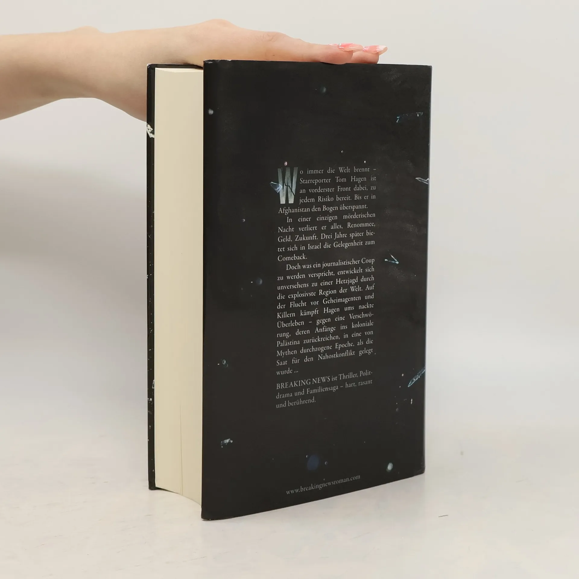 Thriller, Politdrama und Familiensaga – hart, rasant und berührend. Tom Hagen, gefeierter Star unter den Krisenberichterstattern, ist nicht zimperlich, wenn es um eine gute Story geht. Die Länder des Nahen Ostens sind sein Spezialgebiet, seine Reportagen Berichte aus der Hölle. Doch in Afghanistan verlässt ihn sein Glück. Eine nächtliche Geiselbefreiung endet im Desaster. Hagens Ruf ist ruiniert, verzweifelt kämpft er um sein Comeback. Drei Jahre später bietet sich die Gelegenheit in Tel Aviv, als ihm Daten des israelischen Inlandgeheimdienstes zugespielt werden. Hagen ergreift die Chance - und setzt ungewollt eine tödliche Kettenreaktion in Gang... Breaking News ist ein mitreißender Thriller vor dem Hintergrund einer epischen Saga. Zwei Familien wandern Ende der zwanziger Jahre nach Palästina ein – in eine von Legenden, Kämpfen und Hoffnungen beherrschte neue Welt, wo Juden, Araber und britische Kolonialherren erbittert um die Vorherrschaft ringen. Bis in die Gegenwart, über Generationen hinweg, spiegeln und prägen beide Familien Israels atemlose Entwicklung. Als Hagen in der jungen Ärztin Yael Kahn eine unerwartete Verbündete findet, erkennt er, dass auch sein Schicksal eng mit der Geschichte des Landes verbunden ist. Doch mit Yael an seiner Seite gehen die Probleme erst richtig los.