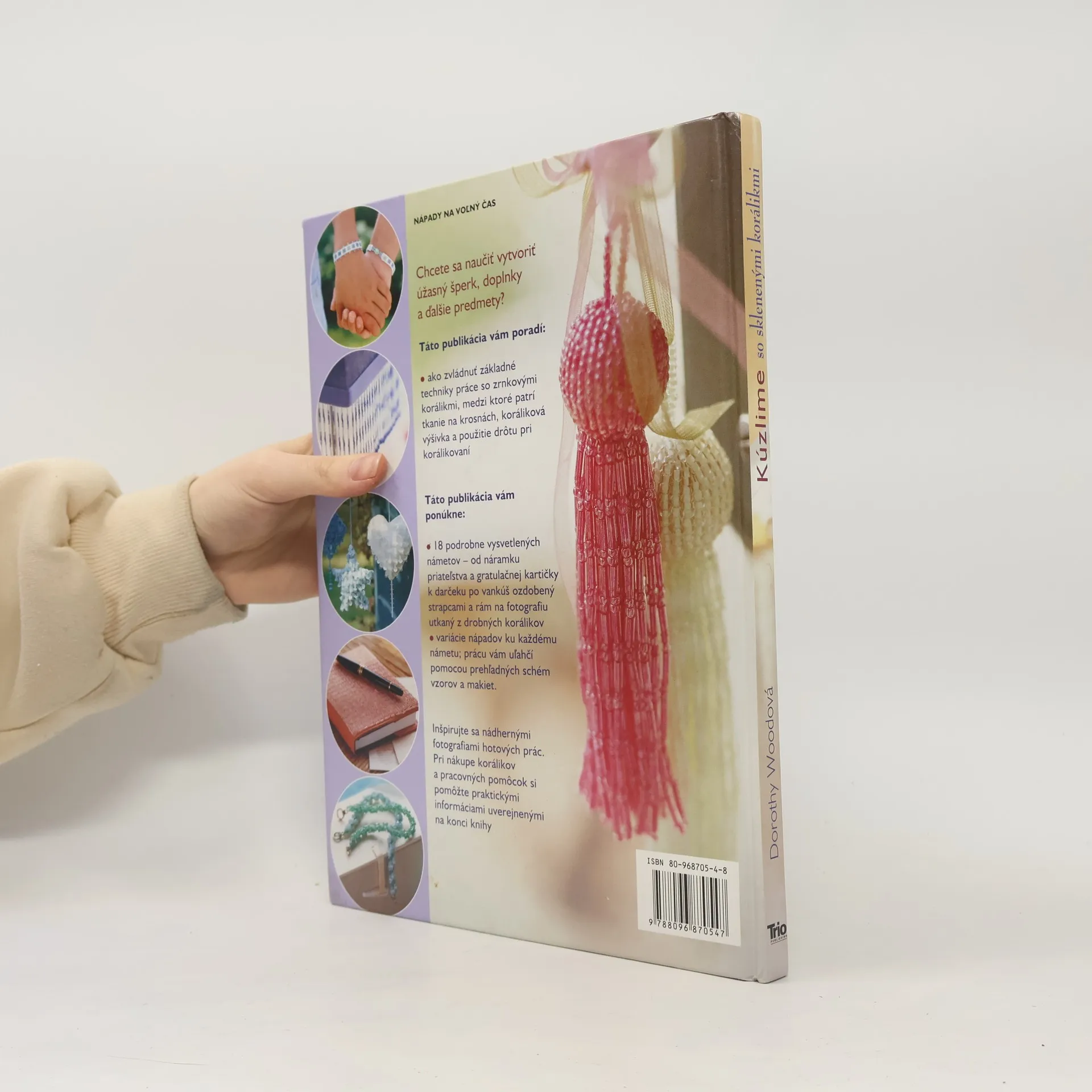 Výroba darčekov z korálikov. Obsah: Materiály a pomôcky, Techniky, Námety, Práca s korálikmi na krosnách-Náramok priateľstva, Rám v štýle safari, Škatuľka na drobnosti, Navliekanie pomocou ihly-Špirálovité náramky, Vrecúško na amulet, Zdobené papuče, Náhradelník a náušnice, Strapce-Vankúš so strapcami, Tienidlo na lampu, Štóla s lemom, Kľúčenka so strapcami, Koráliková výšivka-Obal na zápisník, Ozdoby s flitrami, Vrecúška na potpourri, Vak ozvláštnený korálikmi, Drôt a koráliky-Trblietavé podložky, Ligotavé svietniky, Tašky na darčeky, Nákresy a schémy. Prvé vydanie.