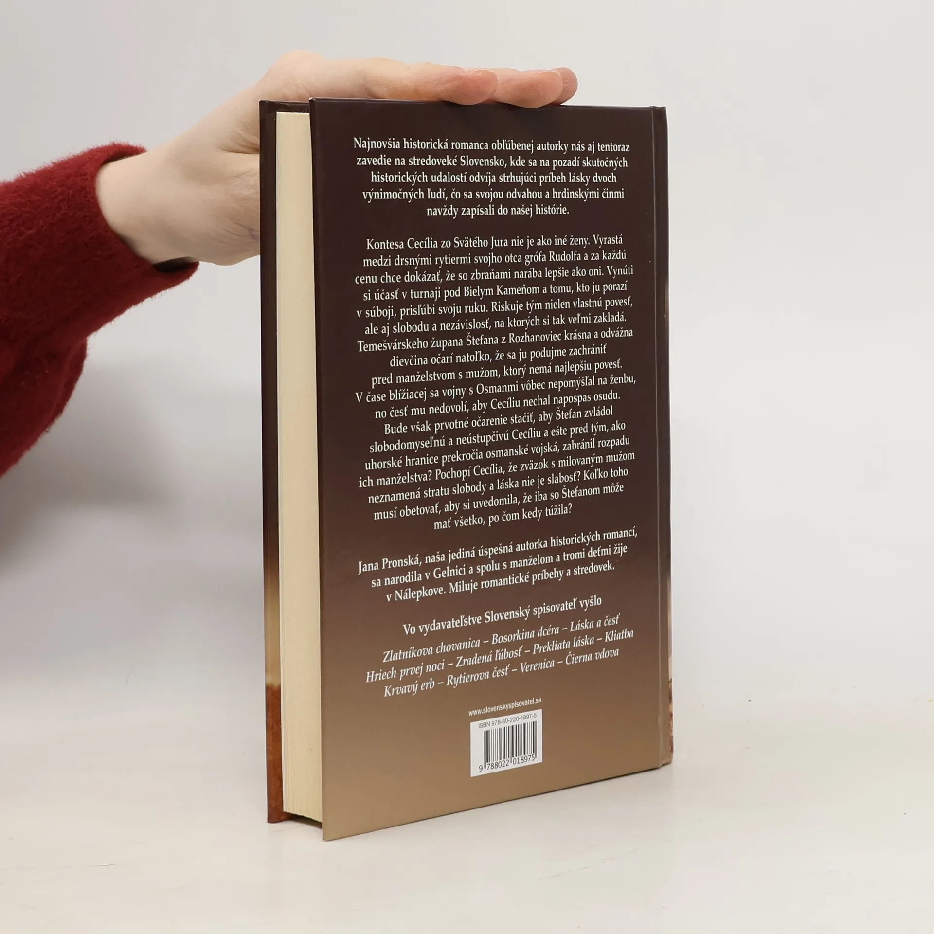 Najnovší román obľúbenej autorky ponúka strhujúci príbeh lásky zo stredovekého Slovenska, odohrávajúci sa na pozadí skutočných historických udalostí. Kontesa Cecília zo Svätého Jura, ktorá narába lukom a mečom lepšie než rytieri jej otca, si vynúti účasť na turnaji pod Bielym Kameňom a tomu, kto ju porazí, prisľúbi svoju ruku. Riskuje tým vlastnú slobodu a nezávislosť, na ktorých si tak veľmi zakladá. Temešvárskeho župana Štefana z Rozhanoviec krásna a odvážna dievčina očarí natoľko, že sa ju podujme zachrániť pred manželstvom s mužom, ktorému ide len o jej veno. V čase blížiacej sa vojny s Osmanmi vôbec nepomýšľal na ženbu, no česť mu nedovolí, aby Cecíliu nechal napospas osudu...