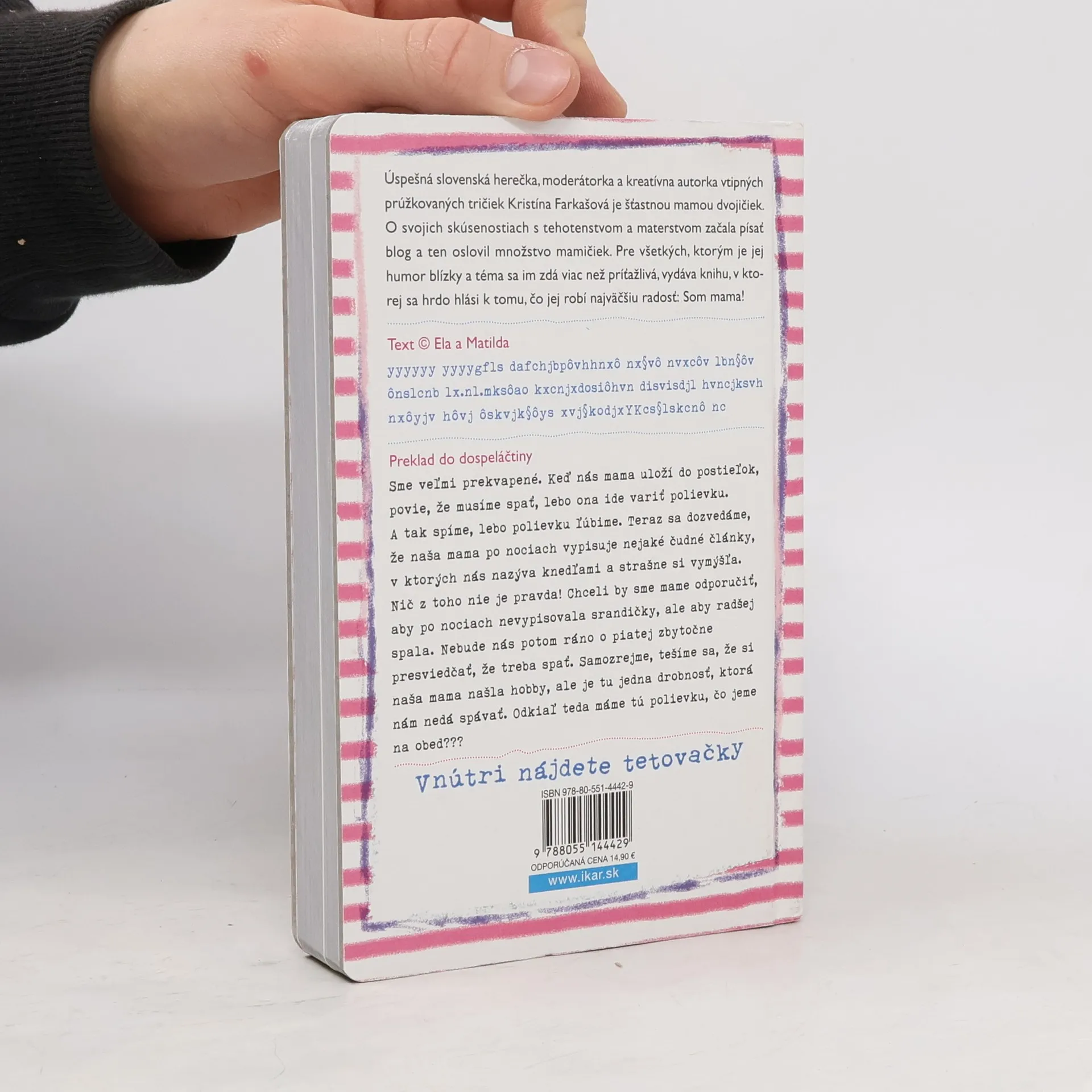 Úspešná slovenská herečka, moderátorka a kreatívna autorka vtipných prúžkovaných tričiek Kristína Farkašová je šťastnou mamou dvojičiek Ely a Matildy. O svojich skúsenostiach a zážitkoch s tehotenstvom a materstvom začala písať vtipný blog a ten oslovil množstvo mamičiek. Pre všetkých, ktorým je jej humor blízky a téma sa im zdá viac než príťažlivá, vydáva knihu, v ktorej sa hrdo hlási k tomu, čo jej robí najväčšiu radosť: Som mama! Ilustroval Boris Farkaš.