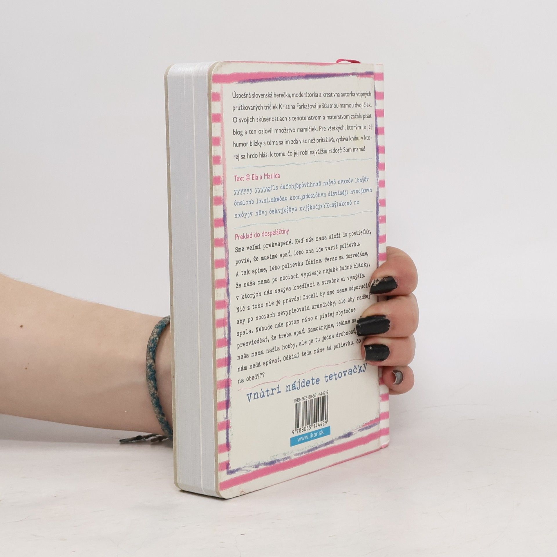 Úspešná slovenská herečka, moderátorka a kreatívna autorka vtipných prúžkovaných tričiek Kristína Farkašová je šťastnou mamou dvojičiek Ely a Matildy. O svojich skúsenostiach a zážitkoch s tehotenstvom a materstvom začala písať vtipný blog a ten oslovil množstvo mamičiek. Pre všetkých, ktorým je jej humor blízky a téma sa im zdá viac než príťažlivá, vydáva knihu, v ktorej sa hrdo hlási k tomu, čo jej robí najväčšiu radosť: Som mama! Ilustroval Boris Farkaš.