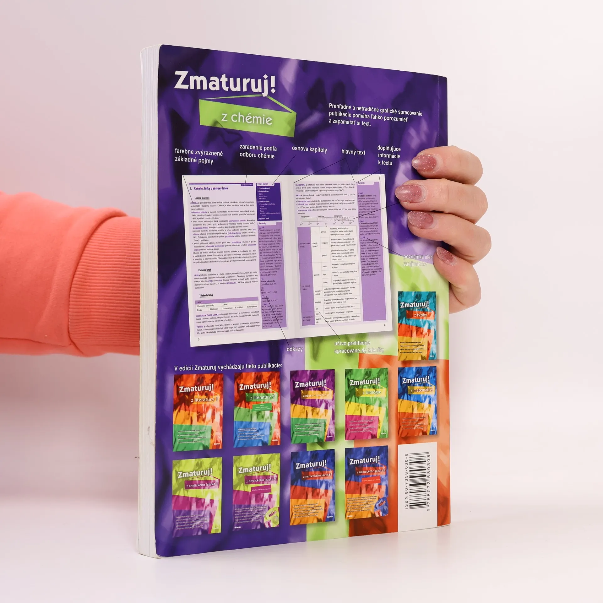 Publikácia podáva prehľadne usporiadané učivo chémie v rozsahu osnov strednej školy. Čitateľa postupne zoznámi s poznatkami zo všeobecnej chémie, anorganickej a organickej chémie, biochémie a tiež termochémie. Porozumenie a zapamätanie učiva podporujú prehľadné tabuľky a názorné schémy, text je doplnený aj príkladmi chemických výpočtov. Orientáciu v texte zjednodušuje členenie učiva na kapitoly a menšie tematické celky i abecedný register pojmov. Prehľadná a svieža grafická úprava uľahčí a spríjemní učenie. Publikácia je určená študentom stredných škôl, ktorí ju využijú počas celého stredoškolského štúdia, na prípravu na maturitu a tiež na prijímacie skúšky na vysoké školy.