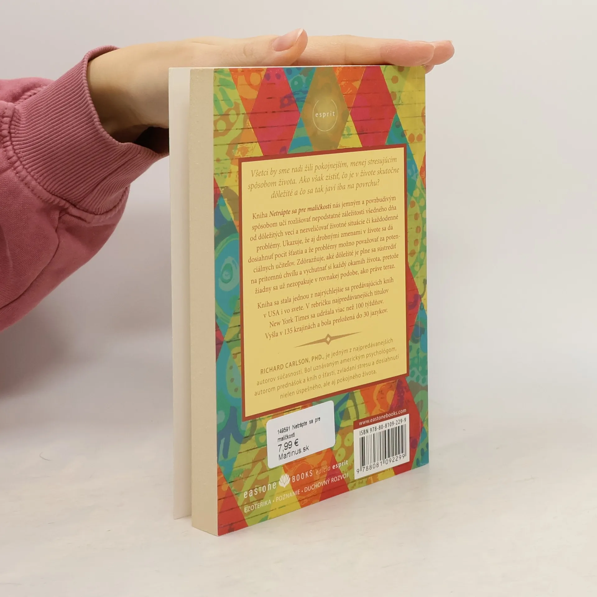 Jednoduché rady, ako sa nenechať ovládnuť nepodstatnými vecami Všetci by sme radi žili pokojnejším, menej stresujúcim spôsobom života. Ako však zistiť, čo je v živote skutočne dôležité a čo sa tak javí iba na povrchu? Táto kniha nás jemným a povzbudivým spôsobom učí rozlišovať nepodstatné záležitosti všedného dňa od dôležitých vecí a nezveličovať každodenné problémy. Ukazuje, že aj drobnými zmenami v živote sa dá dosiahnuť pocit šťastia. Kniha Netrápte sa pre maličkosti... lebo všetko sú maličkosti sa stala jednou z najrýchlejšie sa predávajúcich kníh v Spojených štátoch amerických i vo svete. Vyšla v 135 krajinách a bola preložená do 30 jazykov.