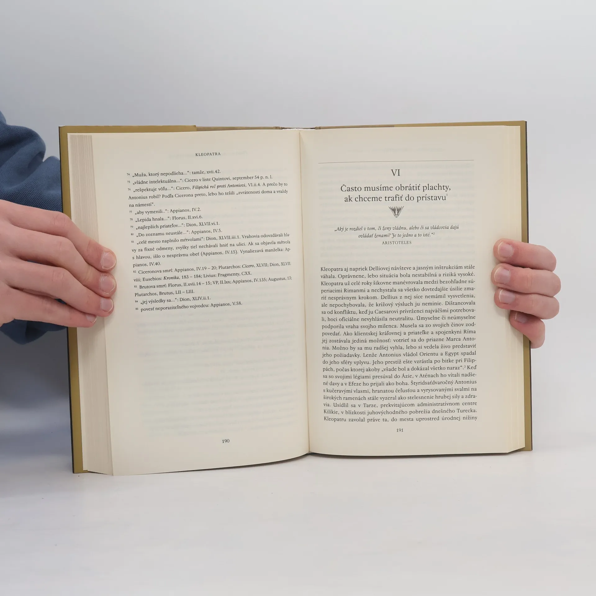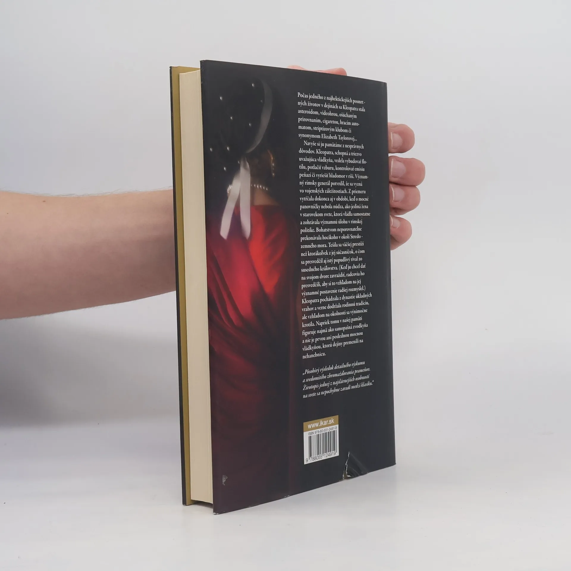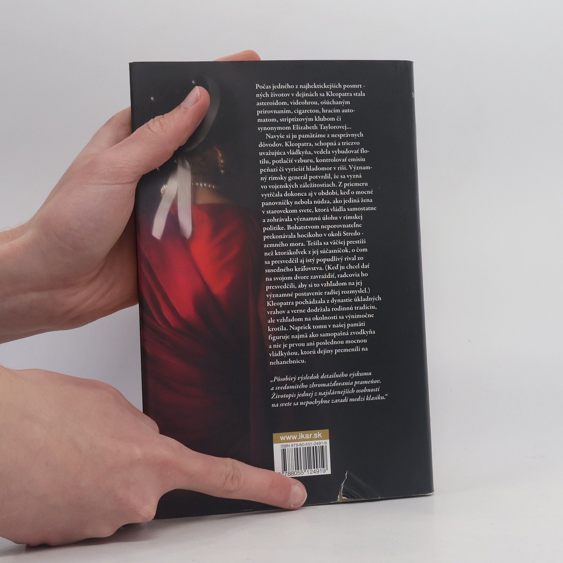 Jej palác sa leskol ónyxami, rubínmi a zlatom, ale ešte viac prekypoval politickými a ľúbostnými intrigami. Kleopatra dosiahla úspechy bystrým plánovaním a rafinovaným vyjednávaním. Dožila sa sotva štyridsať rokov, no stihla pretvoriť obrysy starovekého sveta. Vydala sa dvakrát, obaja muži boli jej bratia, pričom prvého zabila v občianskej vojne a druhého otrávila. Zbavila sa aj ambicióznej sestry. Incestné manželstvá a úkladné vraždy boli rodinnými špecialitami. Napriek tomu, že Kleopatra mala skutočné vzťahy iba s Iuliom Caesarom a Marcom Antoniom, obaja boli ženatí. S Caesarom mala dieťa a s Antoniom ďalšie tri. Ich spojenectvo sa snažilo založiť novú ríšu, aj keď sa im to nakoniec stalo osudným. Kleopatra si vyslúžila slávu dávno predtým, než sa jej meno stalo otrepanou frázou. Shakespeare a Shaw jej vkladali slová, Michelangelo a Tiepolo jej prepožičali tvár. Jej výnimočná osobnosť a dramatické okolnosti života sa však postupne vytratili. Stacy Schiffová majstrovsky oddelila fakty od výmyslov a postavila túto neodolateľnú kráľovnú, ktorej smrť znamenala začiatok novej epochy, do nového svetla. Dielo ponúka sugestívny pohľad na očarujúci životný príbeh.