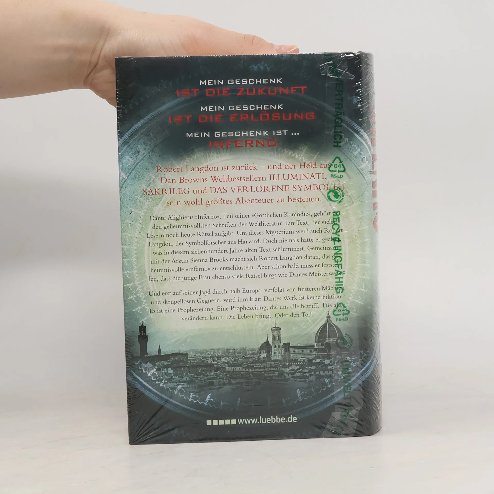 Robert Langdon, Harvard-Professor für Symbologie, erwacht mit einer Schusswunde in einem Krankenhaus in Florenz und hat keine Erinnerung an die letzten zwei Tage. Nach einem Anschlag flieht er mit der jungen Ärztin Sienna Brooks in deren Wohnung. Dort entdeckt er, dass er an der Entschlüsselung einer versteckten Botschaft in einem jahrhundertealten Gemälde zu Dantes „Inferno“ gearbeitet hat. Die Spur führt sie in den Palazzo Vecchio, wo sie sich von Dantes Totenmaske konkrete Hinweise erhoffen, doch diese wurde gestohlen. Langdon und Brooks müssen nun durch halb Europa jagen, um die Maske wiederzufinden und einen perfiden Plan zu vereiteln. Dan Brown, 1964 in New Hampshire geboren, studierte Englisch und Spanisch, bevor er sich Mitte der 90er Jahre ganz dem Schreiben widmete. Sein erster Roman, „Diabolus“, erschien 1998, doch der große Durchbruch kam 2000 mit „Illuminati“, dem ersten Thriller um Langdon. Brown kombiniert geschickt Thriller-Elemente mit religions- und kunsthistorischen Fakten, was ihm ein breites Publikum sichert. Mit diesem Werk präsentiert er den vierten spannenden Thriller um den Symbolologen Robert Langdon.