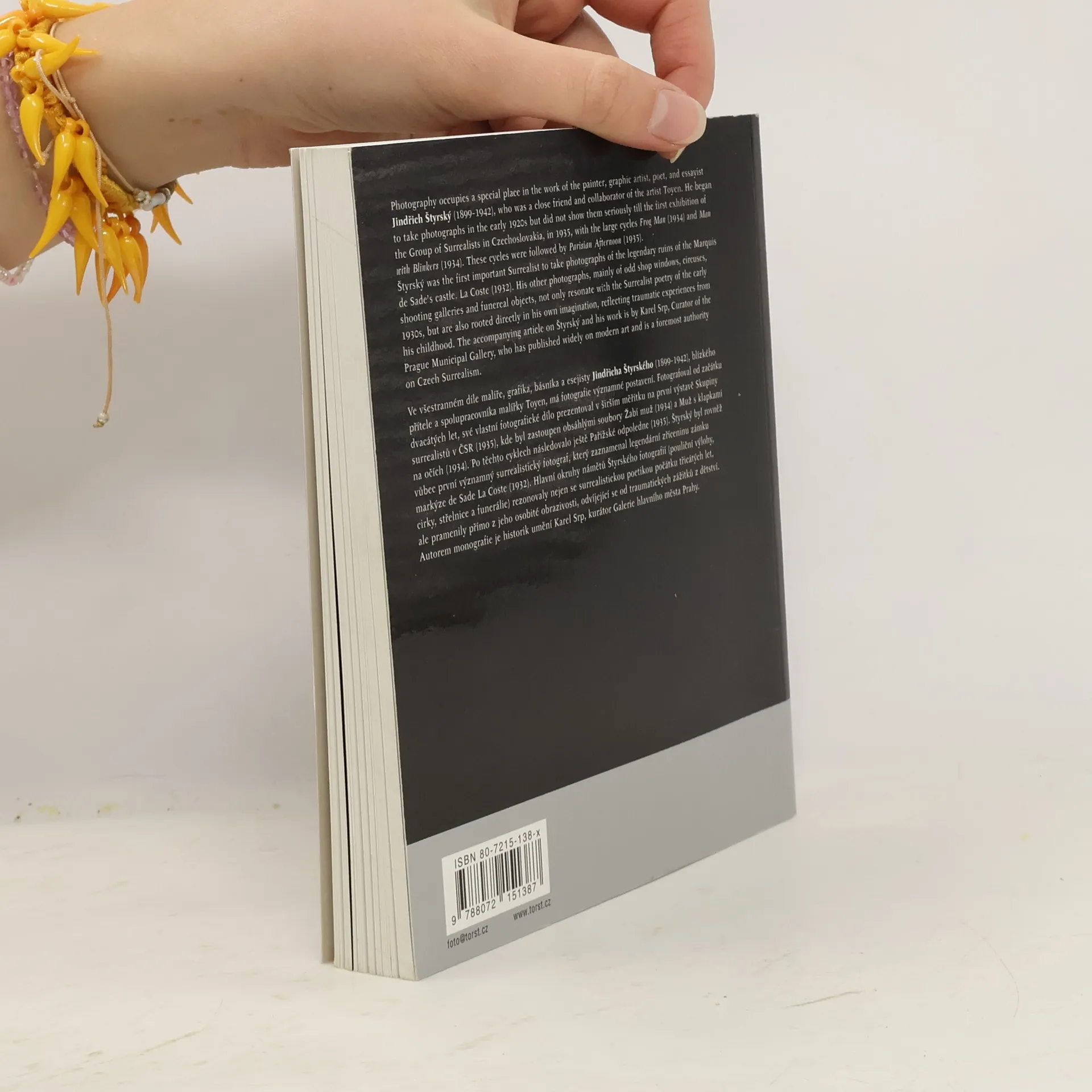 Precizní monografie o Štyrského fotografickém díle představuje slavného surrealistu jako jednoho z nejpozoruhodnějších českých předválečných fotografů. Ve všestranném díle malíře, grafika, básníka a esejisty Jindřicha Štyrského (1899-1942), blízkého přítele a spolupracovníka malířky Toyen, má fotografie významné postavení. Fotografoval od začátku dvacátých let, své vlastní fotografické dílo prezentoval v širším měřítku na první výstavě Skupiny surrealistů v ČSR (1935), kde byl zastoupen obsáhlými soubory Žabí muž (1934) a Muž s klapkami na očích (1934). Po těchto cyklech následovalo ještě Pařížské odpoledne (1935). Štyrský byl rovněž vůbec první významný surrealistický fotograf, který zaznamenal legendární zříceninu zámku markýze de Sade La Coste (1932). Hlavní okruhy námětů Štyrského fotografií (pouliční výlohy, cirky, střelnice a funerálie) rezonovaly nejen se surrealistickou poetikou počátku třicátých let, ale pramenily přímo z jeho osobité obrazivosti, odvíjející se od traumatických zážitků z dětství. Autorem monografie je historik umění Karel Srp, kurátor Galerie hlavního města Prahy.