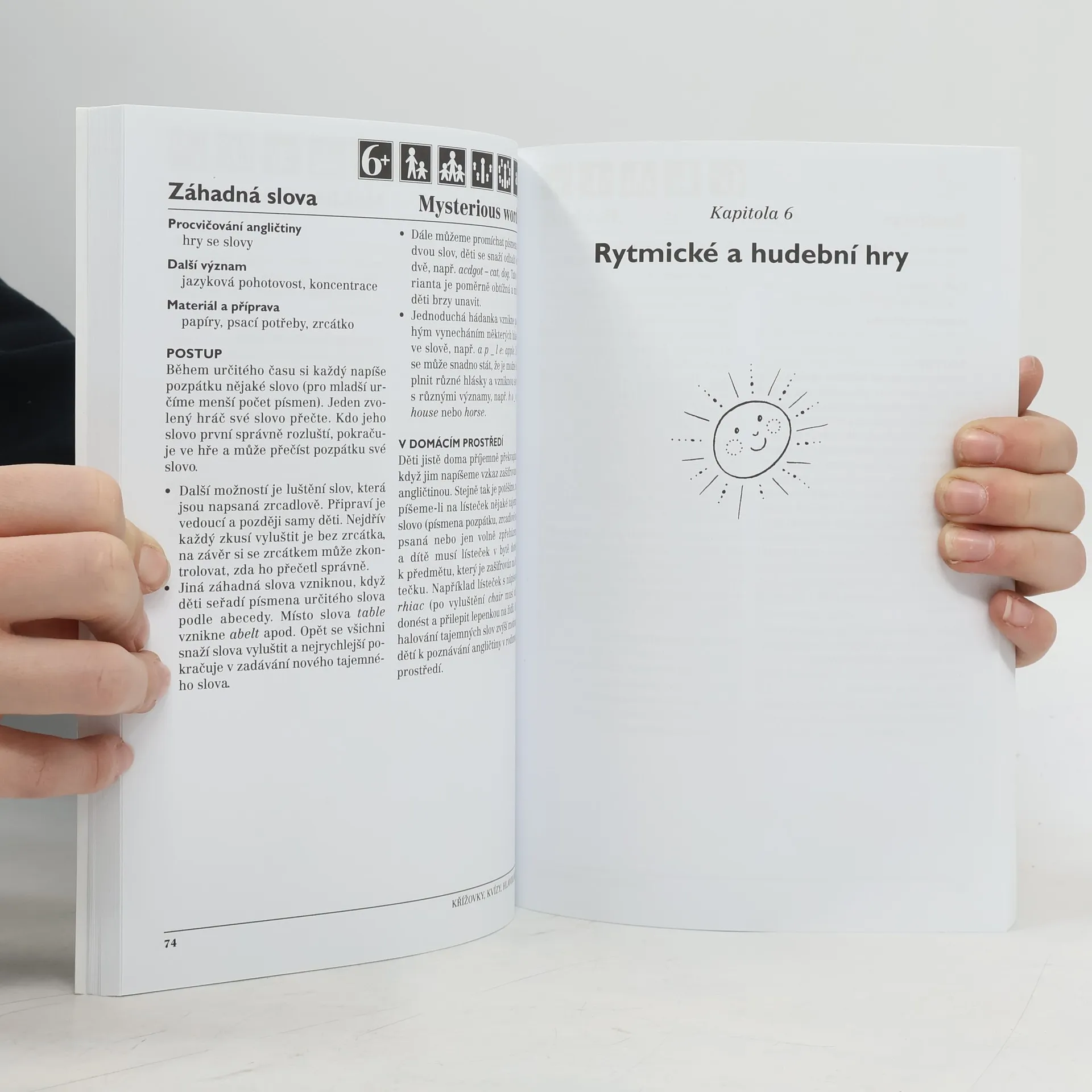 Více než 160 pohybových, dramatických a výtvarných her pro procvičování angličtiny Děti při nich využijí spelování, slovíčka z různých tematických okruhů, základní konverzační obraty a hlavně se naučí angličtině rozumět a používat ji při běžných činnostech. Při pohybu a řešení nejrůznějších úkolů získávají děti jazykové znalosti snadněji a intenzivněji než při "biflování". Právě aktivní radostný přístup k jazyku a využití angličtiny při poznávání všemi smysly i při pohybu považují autorky za nejdůležitější. Činnosti využijí nejen učitelé a vedoucí kroužků anglického jazyka se skupinou dětí, v knize nechybí ani hry pro rodiče s jedním dítětem. U každé hry jsou uvedeny informace důležité při přípravě, témata procvičovaná v angličtině i různé varianty a využití aktivity v domácím prostředí.