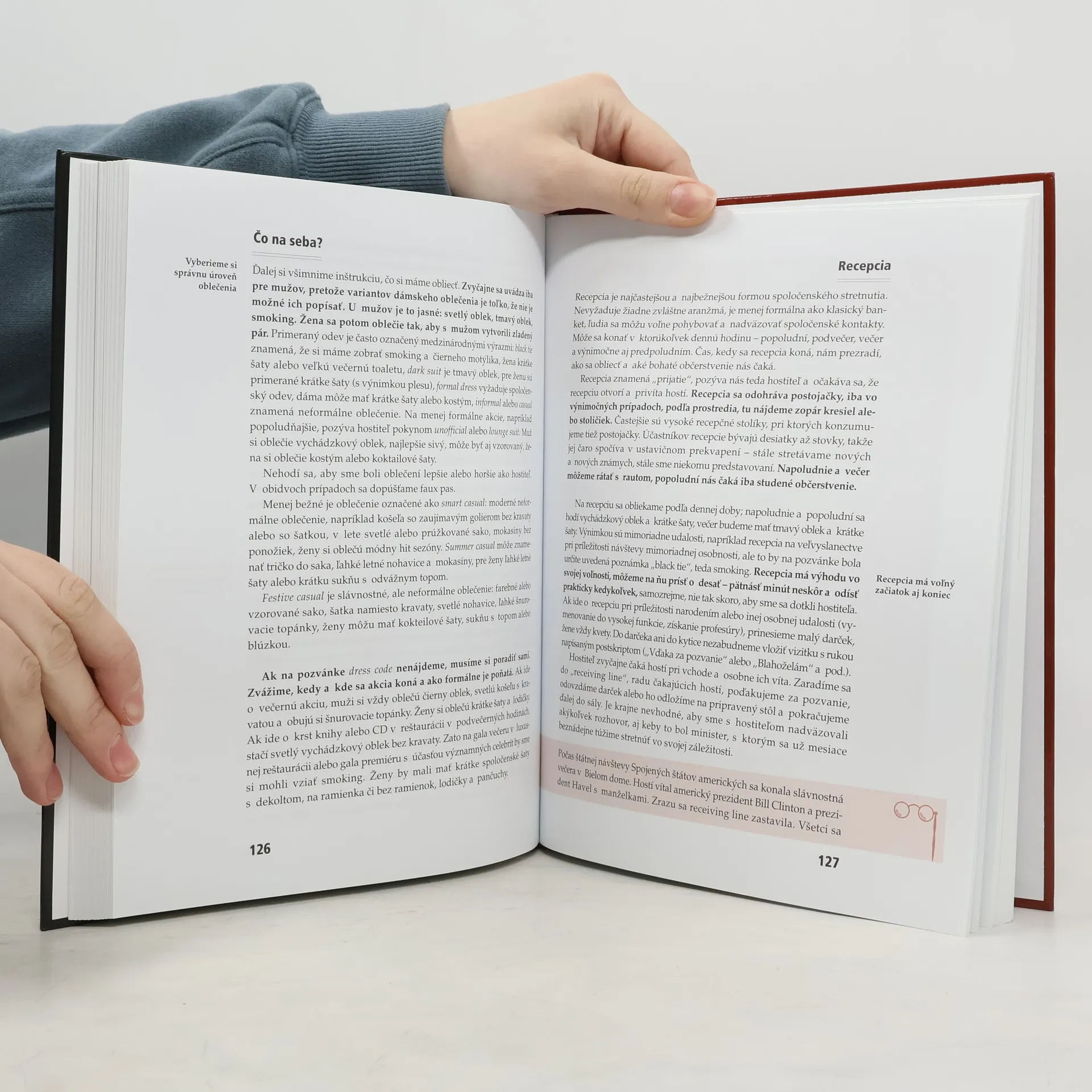Kniha je univerzální průvodce různými společenskými událostmi. Seznamuje čtenáře se všemi formami společenského styku, se správným řešením společenských situací, s pravidly jednání jak doma, tak v cizině. Množstvím informací a rad překonává všechny dosud vydané příručky společenského chování. Poskytuje praktické návody, jak se chovat ve společnosti, v kanceláři, na ulici i doma, jak správně stolovat, jak se oblékat, jak se chovat na recepci, na banketu, jak připravit návštěvu ústavního činitele, jak jednat se zahraničními partnery. Vychází ze soudobého pojetí etikety a protokolu. Kniha je nezbytnou pomůckou pro školu, úřad, firmu i rodinu.