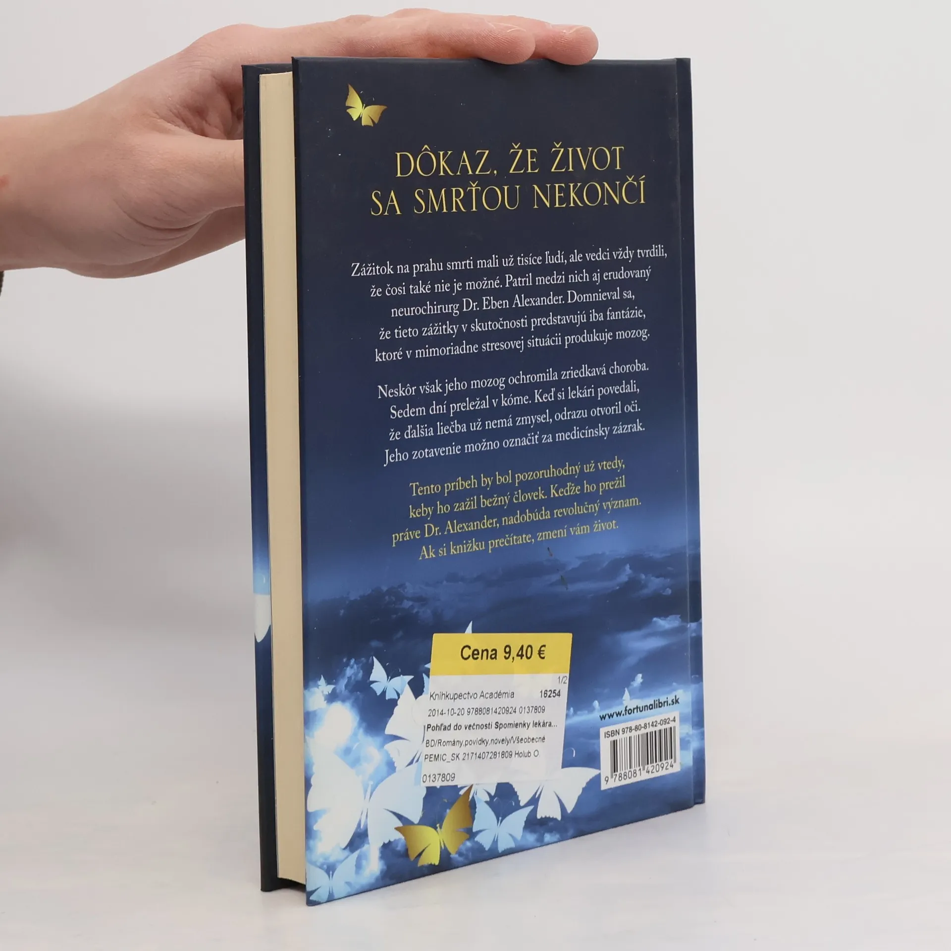 Jedinečný, skutočný príbeh neurochirurga, ktorý opisuje svoje zážitky na prahu smrti. Tento príbeh by bol pozoruhodný už vtedy, keby ho zažil bežný človek. Keďže ho prežil práve Dr. Alexander, nadobúda revolučný význam. Nebude ho môcť ignorovať nijaký vedec či veriaci. Zmení pohľad na život. Dr. Eben Alexander prichádza s naozaj ohromujúcim zážitkom na prahu smrti. Za vyše štyridsať rokov, čo sa venujem tomuto javu, som nepočul o takom šokujúcom príbehu. Výpoveď Dr. Alexandra predstavuje živý dôkaz posmrtného života. Raymond A. Moody, M. D., Ph.D., autor knihy Život po živote Zážitok na prahu smrti mali už tisíce ľudí, ale vedci vždy tvrdili, že čosi také nie je možné. Patril medzi nich aj erudovaný neurochirurg Dr. Eben Alexander. Domnieval sa, že tieto zážitky v skutočnosti predstavujú iba fantázie, ktoré v mimoriadne stresovej situácii produkuje mozog. Neskôr však jeho mozog ochromila zriedkavá choroba. Sedem dní preležal v kóme. Keď si lekári povedali, že ďalšia liečba už nemá zmysel, odrazu otvoril oči. Jeho zotavenie možno označiť za medicínsky zázrak. Skutočný zázrak jeho príbehu spočíva v niečom inom. Kým ležal v kóme, prenikol za hranice tohto sveta a spoznal anjelskú bytosť, ktorá ho zaviedla do najhlbších zákutí nadpozemskej existencie.