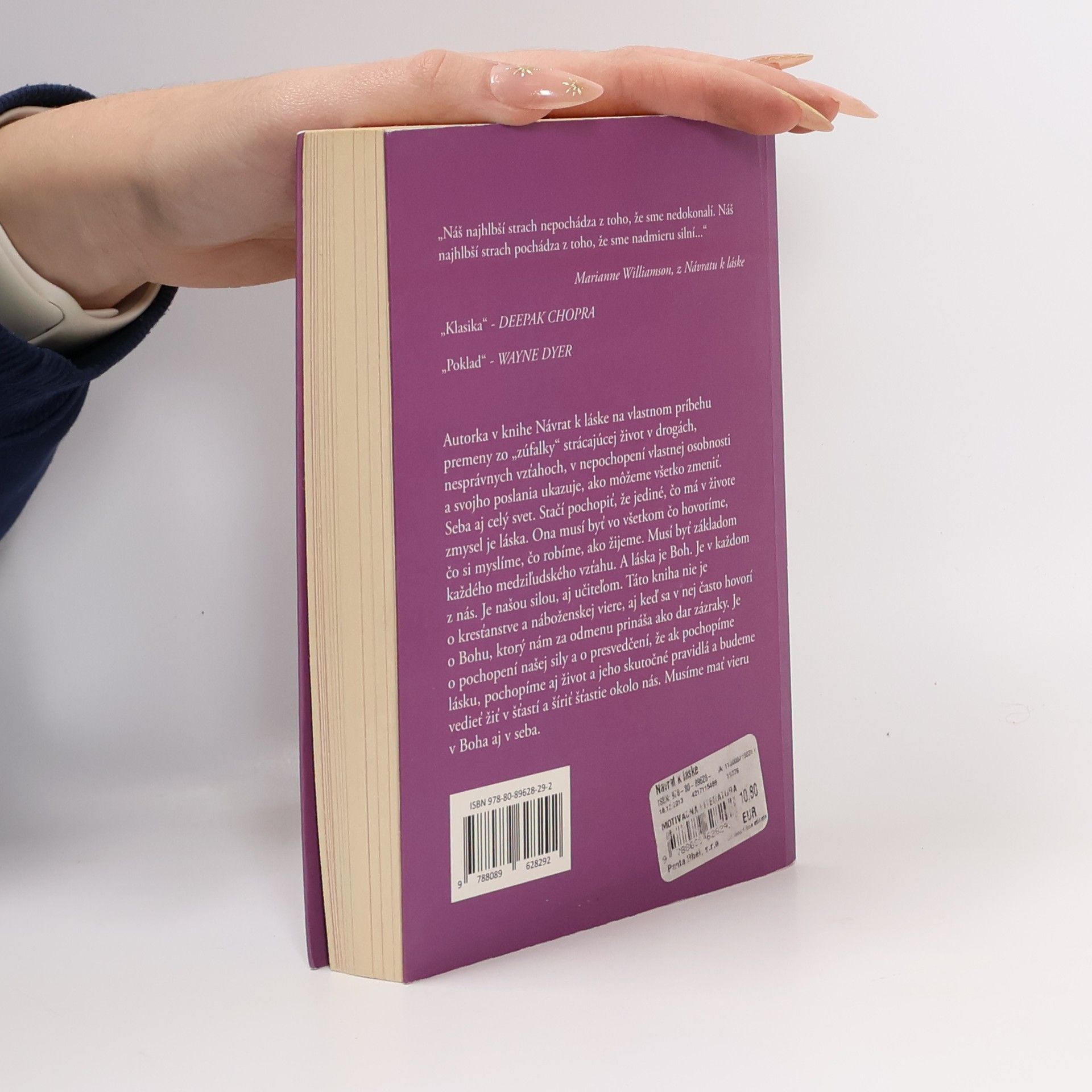Ak hľadáte vzťah s Bohom a pochopenie Kristovej lásky inak ako cez kresťanské náboženstvo, nemôže vo vašej knižnici chýbať dielo úspešnej autorky a skúsenej ženy, ktorú sám život navrátil k Bohu - ku zdroju lásky, našej sily a premeny. V ťažkom zúfalstve z nepochopených lekcií života, našla „náhodou“ Kurz zázrakov. Toto dielo potom aplikovala do denného života a vyriešila si problémy so sebou, s drogami, s milencami, s chudobou aj s rodičmi vďaka pochopeniu, že láska je najsilnejšia energia na zemi a že v každom z nás prebýva Boh. Sila, ktorá nám v každom okamihu pomáha vstať a ísť ďalej v ústrety láske a šťastiu. A to je ten zázrak, ktorý dokáže každý z nás. A tým dokáže zmeniť svet na lepšie miesto pre nás aj tých, čo prídu po nás. Návod je v jednotlivých kapitolách a v ich pochopení. Niekto nazval jej učenie duchovná psychoterapia. Všetci vieme, že duch sa nedá oddeliť od duše a tela, že je ich výživou a hybnou silou a preto môžeme smelo nazvať knihu Návrat k láske liekom. Táto kniha rozhodne zmení váš život.