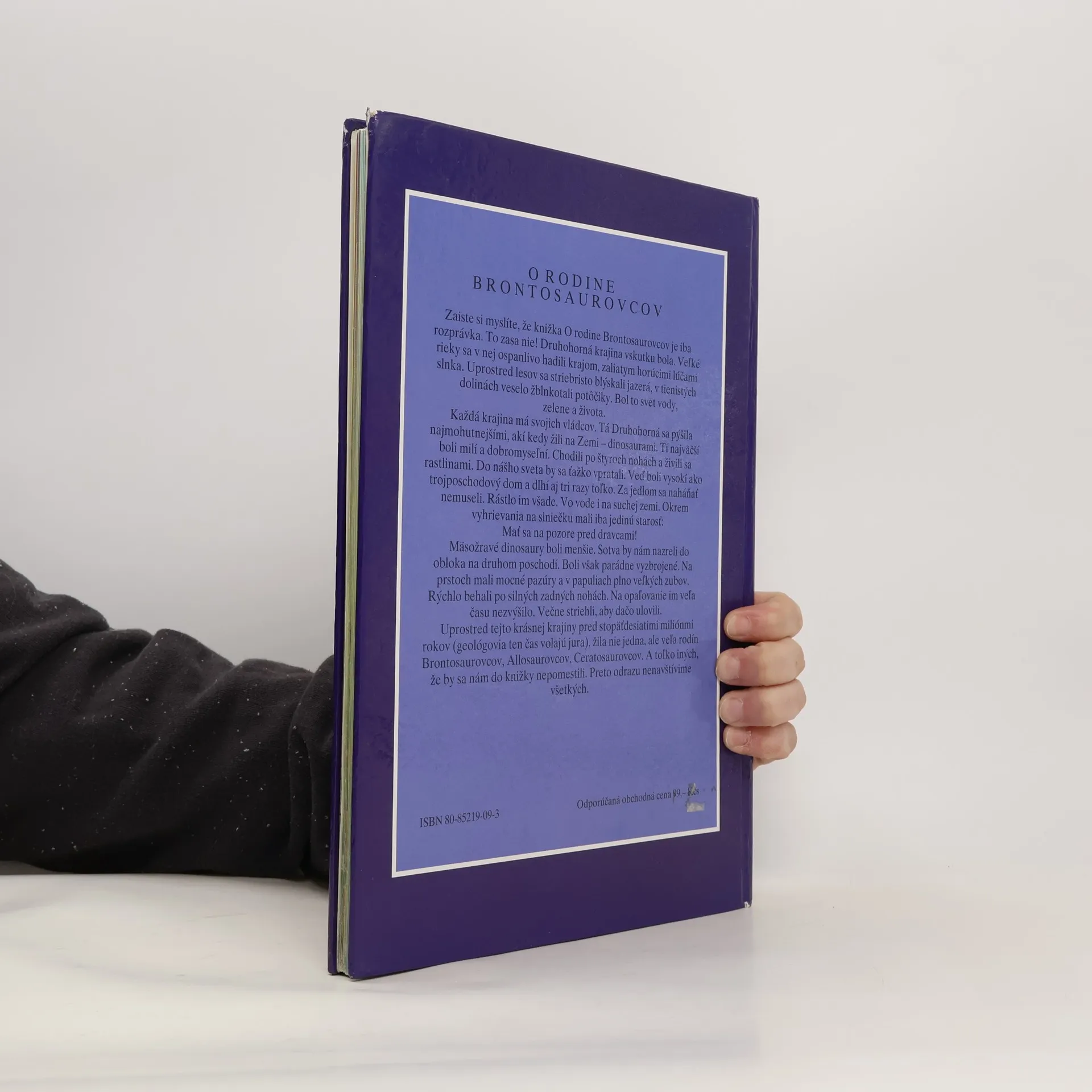 Určitě si myslíte, že knížka o Brontosauří rodině je jenom pohádka. Tak, to tedy ne! Druhohorní krajina skutečně existovala. Krajina, zalitá horkými paprsky slunce, kterou se ospale plazily velké řeky. Uprostřed lesů se stříbřitě blýskala jezera, v stinných dolinách vesele zurčely potůčky. Byl to svět vody, zeleně a života. Každá krajina má své vládce. Druhohorní se pyšnila nejmohutnějšími, jací kdy na Zemi žili - dinosaury. Největší z nich byli milí a dobromyslní. Chodili po čtyřech a živili se rostlinami. Těžko by se vměstnali do našeho světa. Vždyť byli vysocí jako třípatrový dům a dlouzí až třikrát tolik. Hnát za potravou se nemuseli. Rostla jim všude. Na zemi i ve vodě. Kromě vyhřívání na sluníčku měli jenom jedinou starost - se mít na pozoru před dravci! Masožraví dinosauři byli menší. Sotva by nahlédli do oken na druhém poschodí. Ale byli parádně vyzbrojeni. Na prstech měli mohutné drápy a v tlamách plno velikých zubů. Rychle se pohybovali na silných zadních nohách. Na slunění jim mnoho času nezbývalo. Neustále byli ve střehu, aby něco ulovili. Před sto padesáti milióny lety (geologové této době říkají jura) žila uprostřed této krásné krajiny ne jedna, ale hodně Brontosaurových, Allosaurových, Ceratosaurových rodin. A tolik jiných, že by se nám do knížky nevešly. Proto je všechny najednou nenavštívíme.
