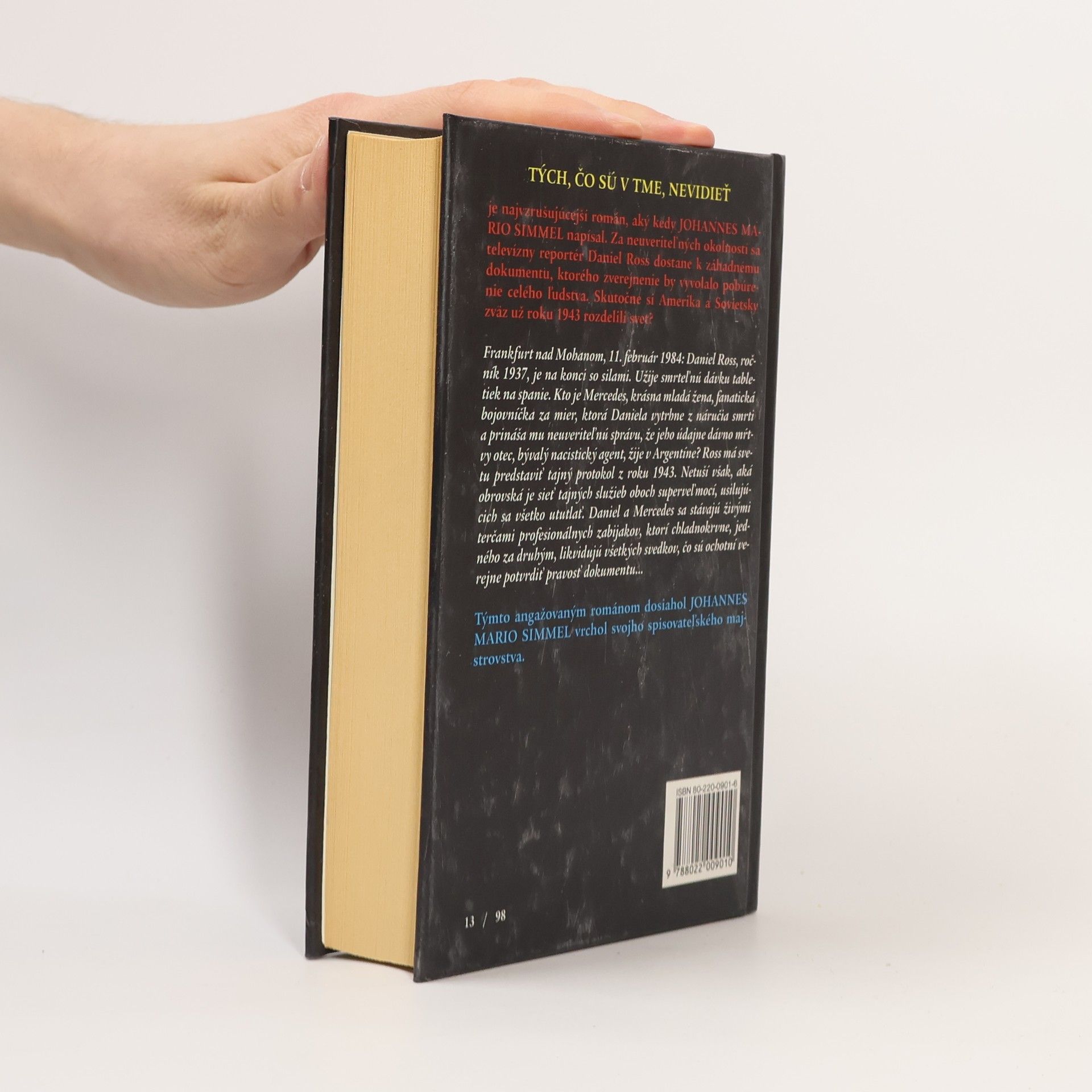 Z nemeckého originálu Die im Dunkeln sieht man nicht. Najvzrušujúcejší román, aký kedy Simmel napísal. Za neuveriteľných okolností sa televízny reportér Daniel Ross dostane k záhadnému dokumentu, ktorého zverejnenie by vyvolalo pobúrenie celého ľudstva. Skutočne si Amerika a Sovietsky zväz už roku 1943 rozdelili svet? Frankfurt nad Mohanom, 11. februára 1984 - Daniel Ross, je na konci so silami. Užije smrteľnú dávku tabletiek na spanie. Kto je Mercedes, krásna mladá žena, fantastická bojovníčka za mier, ktorá Daniela vytrhne z náručia smrti a prináša mu neuveriteľnú správu, že jeho údajne dávno mŕtvy otec, bývalý nacistický agent, žije v Argentíne? Ross má svetu predstaviť tajný protokol z roku 1943. Netuší však, aká obrovská je sieť tajných služieb oboch superveľmocí, usilujúcich sa všetko ututlať. Daniel a Mercedes sa stávajú živými terčami profesionálnych zabijakov, ktorí chladnokrvne, jedného za druhým, likvidujú všetkých svedkov, čo sú ochotní verejne potvrdiť pravosť dokumentu...