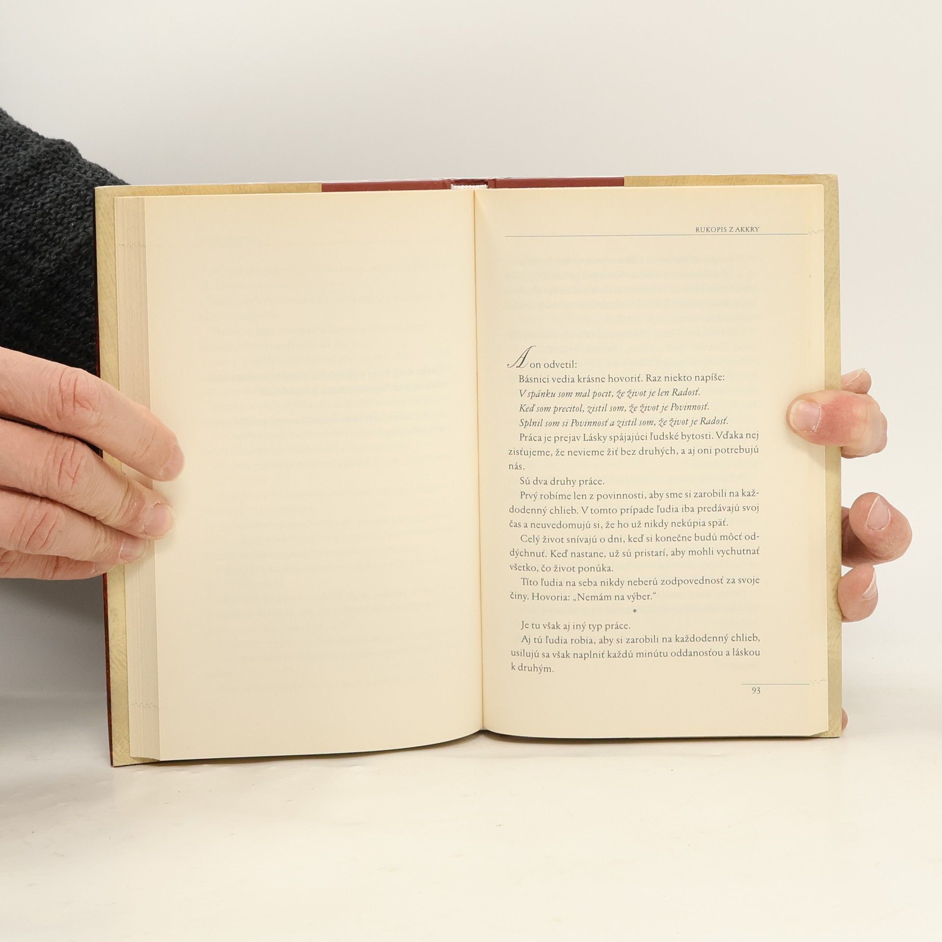 Ktoré hodnoty zostávajú, keď je všetko zničené? Je 14. júl 1099. Kým sa Jeruzalem pripravuje na vpád križiakov, Grék známy pod menom Kopta zvolá v meste stretnutie starých aj mladých, mužov aj žien. Kresťania, židia aj moslimovia, ktorí sa zídu na námestí, sú presvedčení, že si vypočujú prednášku, ako sa pripraviť na boj, Kopta im však chce povedať čosi iné. Všetko naznačuje, že stoja pred porážkou, no Grék ich nabáda, aby v každodennom živote nachádzali múdrosť, akou odpovedá na výzvy a ťažkosti. Verí, že skutočné poznanie je ukryté v prežitých láskach, utrpených stratách, vo chvíľach beznádeje i víťazstiev a v každodennom spolunažívaní s nevyhnutnosťou smrti. Rukopis z Akkry Paula Coelha nás pozýva zamyslieť sa nad našimi zásadami a ľudskosťou.