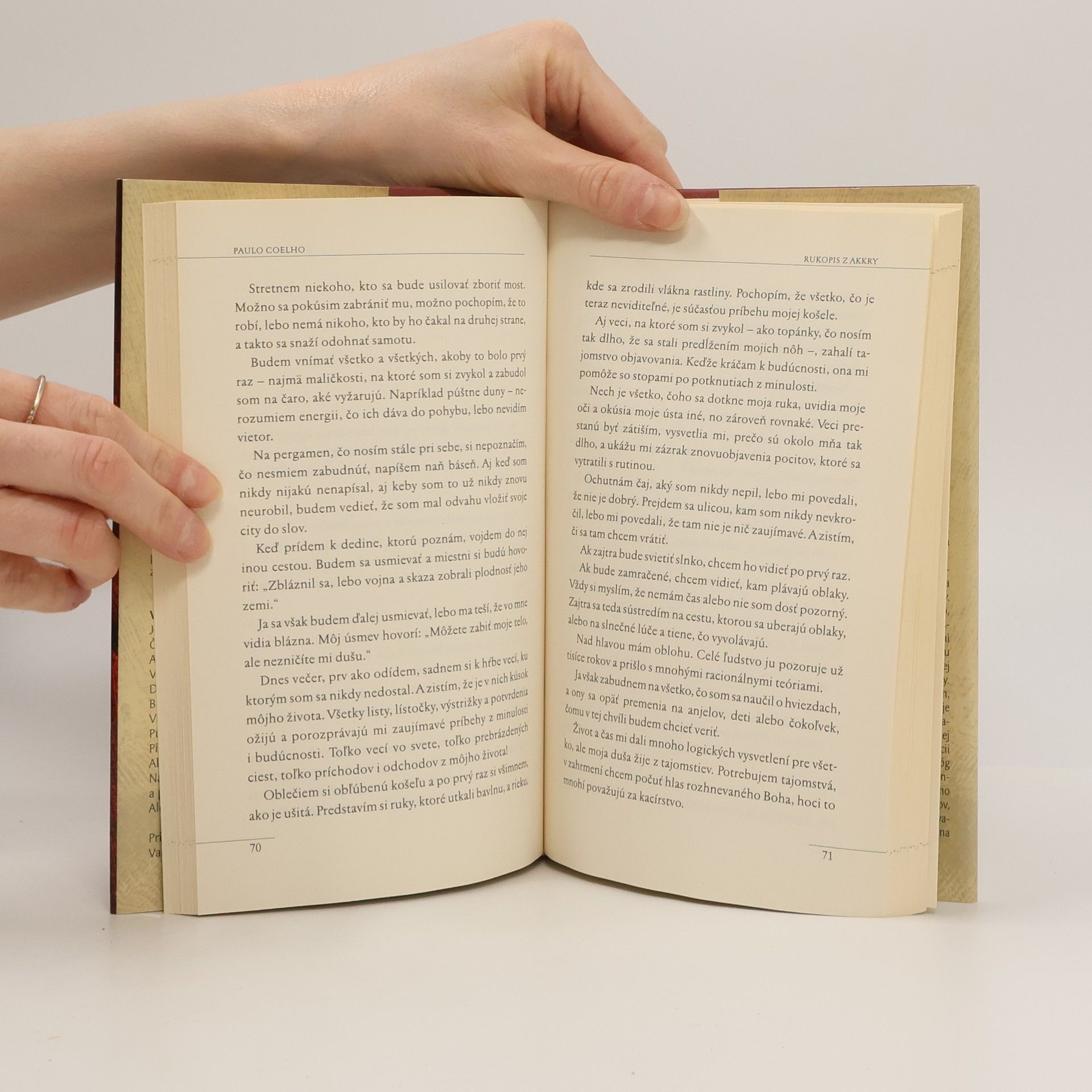 Ktoré hodnoty zostávajú, keď je všetko zničené? Je 14. júl 1099. Kým sa Jeruzalem pripravuje na vpád križiakov, Grék známy pod menom Kopta zvolá v meste stretnutie starých aj mladých, mužov aj žien. Kresťania, židia aj moslimovia, ktorí sa zídu na námestí, sú presvedčení, že si vypočujú prednášku, ako sa pripraviť na boj, Kopta im však chce povedať čosi iné. Všetko naznačuje, že stoja pred porážkou, no Grék ich nabáda, aby v každodennom živote nachádzali múdrosť, akou odpovedá na výzvy a ťažkosti. Verí, že skutočné poznanie je ukryté v prežitých láskach, utrpených stratách, vo chvíľach beznádeje i víťazstiev a v každodennom spolunažívaní s nevyhnutnosťou smrti. Rukopis z Akkry Paula Coelha nás pozýva zamyslieť sa nad našimi zásadami a ľudskosťou.