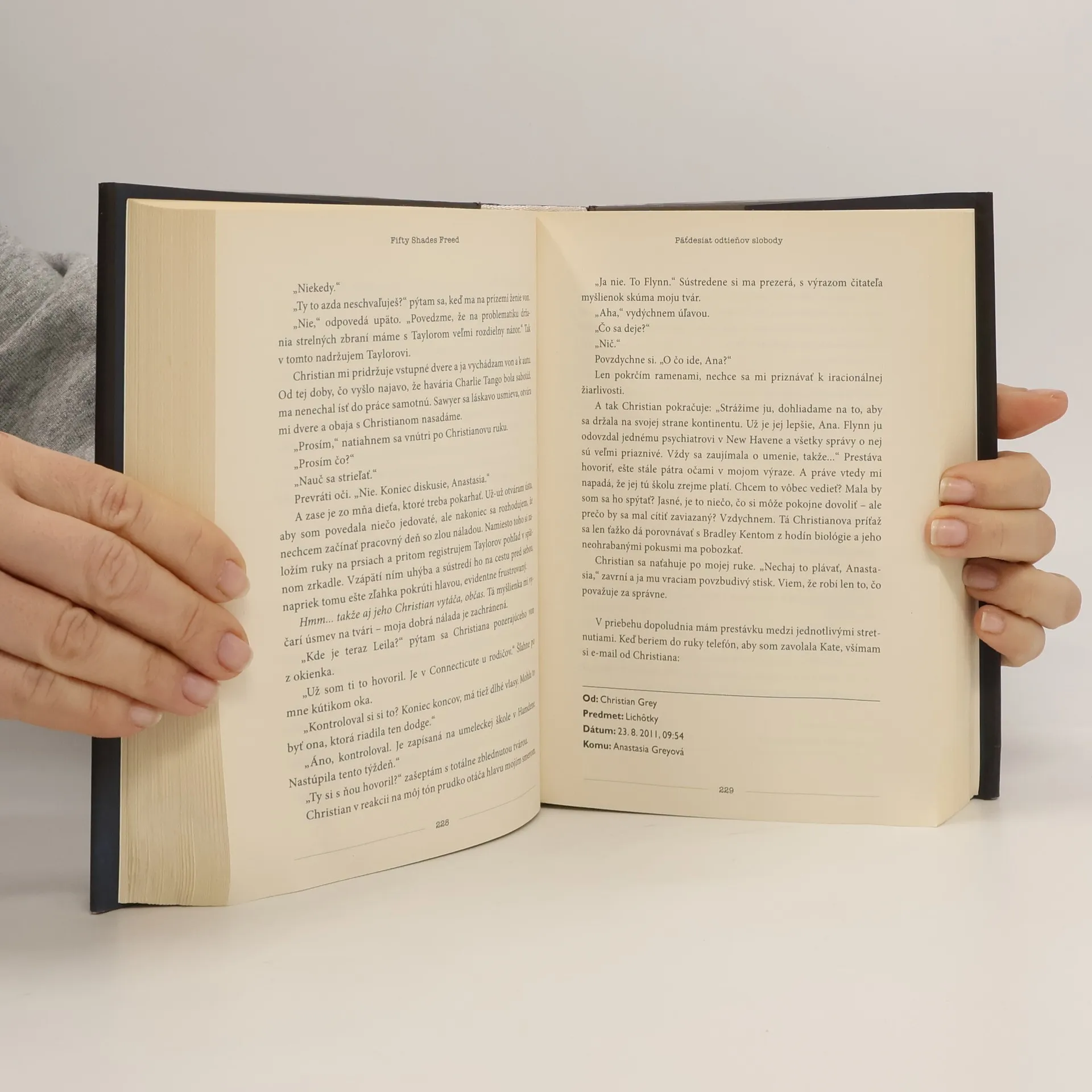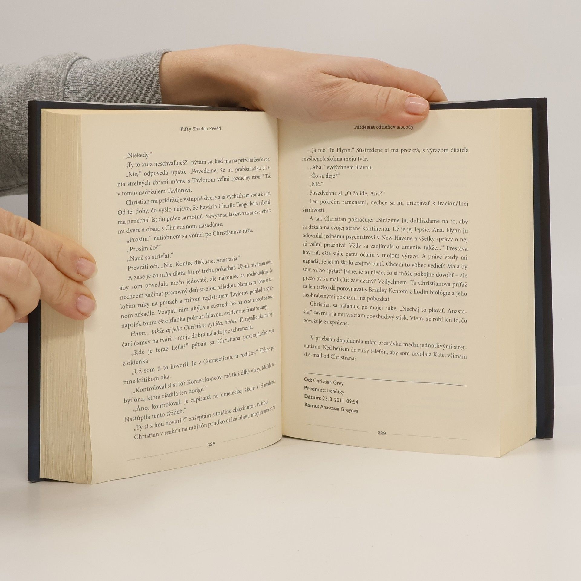 Tretí diel erotického románu, ktorý sa stal svetovým bestsellerom. Anastasia a Christian majú všetko - lásku, vášeň aj bohatstvo. Ale Anastasia tuší, že udržanie lásky pred nich bude klásť výzvy, ktoré si zatiaľ nevie alebo nechce predstaviť... Keď Anastasia Steelová prvý raz stretla mladého úspešného podnikateľa Christiana Greya, netušila, ako veľmi jej to zmení život... Od začiatku vedela, že vzťah s jej Tieňom nebude prechádzka ružovou záhradou. Christianov životný štýl jej nikdy nebol blízky, no musí sa ho naučiť žiť spolu s ním, a to bez toho, aby stratila vlastnú tvár, integritu a nezávislosť. Christian zas musí prekonať svoju posadnutosť kontrolou a vyrovnať sa so svojimi vnútornými démonmi. Teraz, keď sú konečne spolu, zažívajú nekonečnú lásku, vášeň a vzájomnú blízkosť a otvára sa pred nimi svet nekonečných možností. Zdá sa, že im nič nechýba. Náhle však zasiahne osud a pred Annou ožívajú jej najhoršie nočné mory...