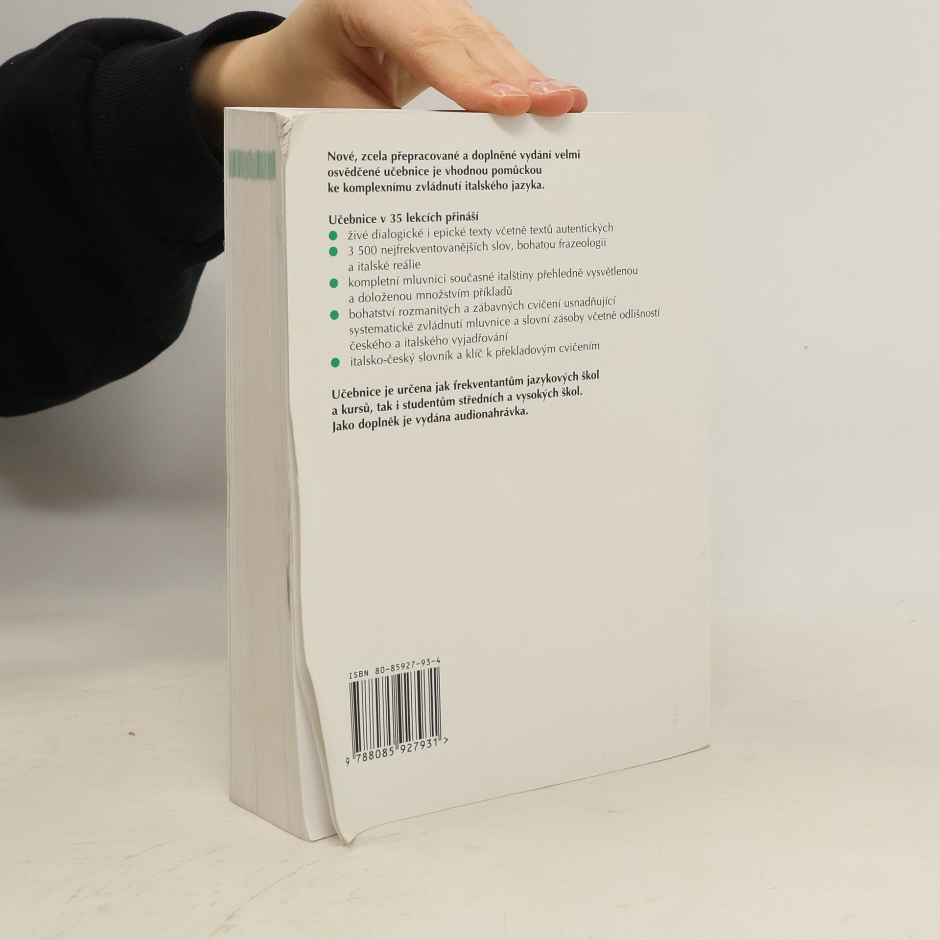 Nejucelenější učebnice italského jazyka na českém knižním trhu ve zcela přepracované a doplněné podobě obsahuje kompletní mluvnici současné italštiny, přibližně 3500 nejfrekventovanějších slov a bohatou frazeologii. Autorky, které mají bohaté pedagogické zkušenosti z výuky italštiny na středních, vysokých i jazykových školách, vysvětlují jednotlivé mluvnické jevy přehledně a srozumitelně, dokládají je množstvím příkladů a nabízejí jejich procvičení v celé řadě rozmanitých a zábavných cvičení. Další cvičení usnadňují zvládnutí slovní zásoby a nácvik komunikativních schopností. Uživatele bezesporu zaujmou i texty zařazené do učebnice zprostředkovávající italské reálie různými formami a četné autentické materiály. Učebnice je určena studentům a pedagogům středních, vysokých a jazykových škol či kursů. Klíč a audionahrávka k učebnici však umožňuje studium rovněž samoukům.