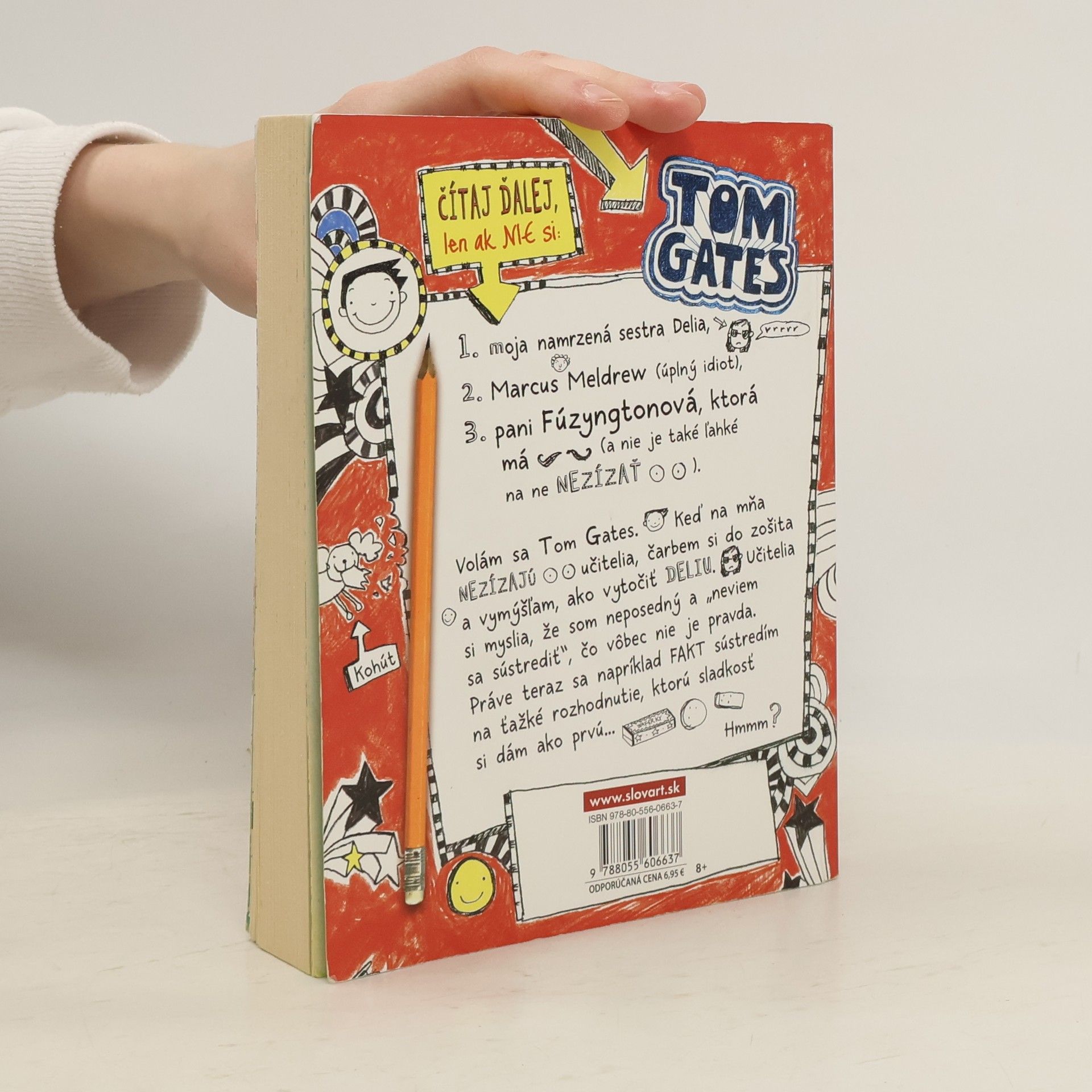 Neskúšajte čítať túto knihu na verejnosti. Budete sa totiž nahlas rehotať! Tom Gates je majstrom výhovoriek, expert na čarbanice a výnimočný tvorca komiksových príbehov. Je tiež nočnou morou pre svojho nevrlého triedneho učiteľa pána Fullermana. V jeho uletenom denníku plnom čarbaníc a nezmyslov nájdete všetky druhy komiksových čarbačiek. Podarí sa niekedy Tomovi spraviť načas domácu úlohu, vyhnúť sa hnevu svojho učiteľa – a urobiť dojem na Amy Porterovú, ktorá sedí vedľa neho?