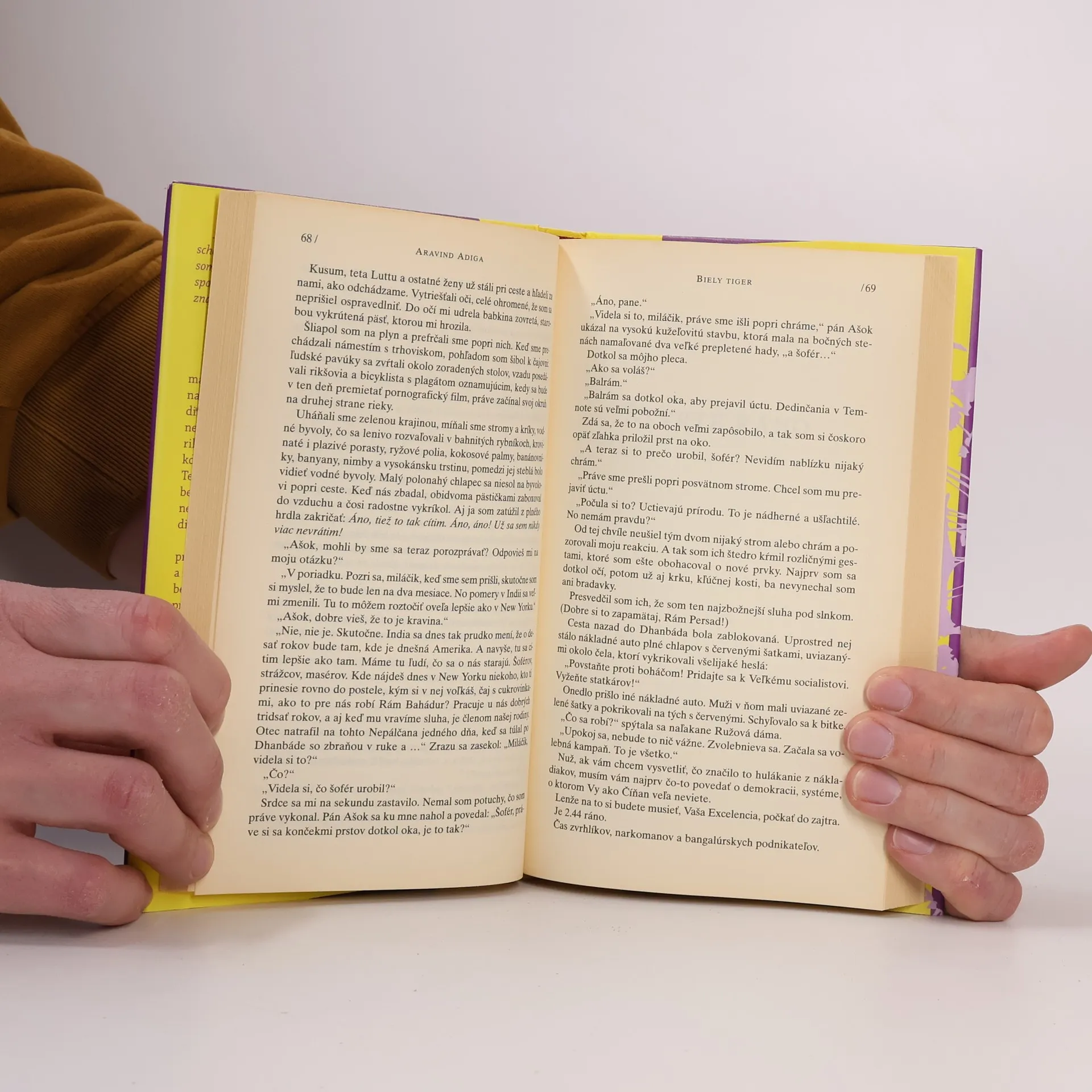 Adiga vo svojom epištolárnom románe otvoril Pandorinu skrinku, z ktorej sa vyvalila pravda. Nič, čo sa tu spomína, neznie falošne alebo nadnesene. Príbeh je šokujúci a strháva pozlátku z dnešnej technokraticky sa rozvíjajúcej Indie, upozorňujúc na nebezpečenstvo hladných, ktorí sú rozhodnutí zobrať si svoj diel z globálneho ekonomického koláča. Tento román sa pokojne môže zaradiť k majstrovským dielam svetovej literatúry. Rozprávač a hlavný protagonista Balrám Halváí sa ako dieťa zúčastní na pohrebe matky, ktorá zomrela za záhadných okolností. Neskôr je svedkom, ako jeho otec, rikša z beznádejne chudobnej kasty, umiera na tuberkulózu v štátnej nemocnici, ktorá je výsmechom indického zdravotníctva. Osirotený Balrám sa rozhodne ujsť pred osudom, uniká pred rodinou a zločinom sa zmocní peňazí, čím si zakladá prosperujúci podnik s taxislužbou. Neprenasledujú ho výčitky svedomia, šokuje ho predstava, že by sa k činu nebol odvážil. Balrám Halváí je komplexná postava, ktorú v škole nazvali Bielym tigrom, vzácnym druhom šelmy. Z malého chlapca sa stáva sluha, filozof, zločinec a nakoniec úspešný podnikateľ. Jeho postupná zmena z nevinného vidieckeho chlapca na chladnokrvného zločinca je fascinujúco vierohodná.