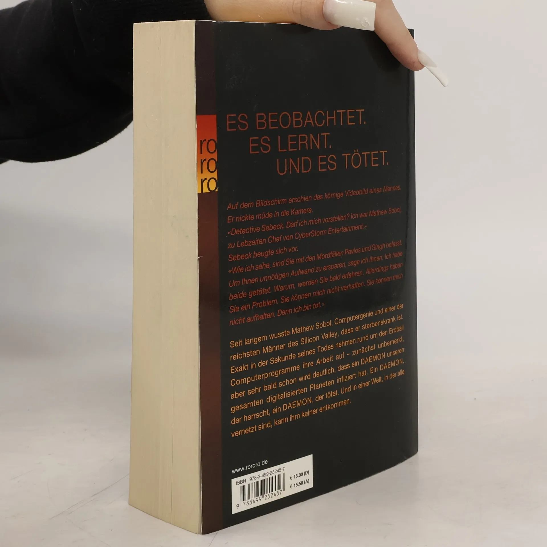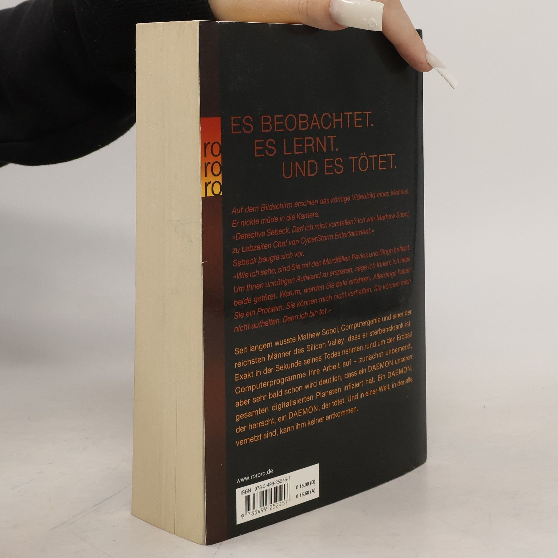 Es beobachtet. Es lernt. Und es tötet. Auf dem Bildschirm erschien das körnige Videobild eines Mannes. Er nickte müde in die Kamera. «Detective Sebeck. Darf ich mich vorstellen? Ich war Matthew Sobol, zu Lebzeiten Chef von CyberStorm Entertainment.» Sebeck beugte sich vor. «Wie ich sehe, sind Sie mit den Mordfällen Pavlos und Singh befasst. Um Ihnen unnötigen Aufwand zu ersparen, sage ich Ihnen: Ich habe beide getötet. Warum, werden Sie bald erfahren. Allerdings haben Sie ein Problem. Sie können mich nicht verhaften. Sie können mich nicht aufhalten. Denn ich bin tot.» Seit langem wusste Matthew Sobol, Computergenie und einer der reichsten Männer des Silicon Valley, dass er sterbenskrank ist. Exakt in der Sekunde seines Todes nehmen rund um den Erdball Computerprogramme ihre Arbeit auf – zunächst unbemerkt, aber sehr bald schon wird deutlich, dass ein DAEMON unseren gesamten digitalisierten Planeten infiziert hat. Ein DAEMON, der herrscht, ein DAEMON, der tötet. Und in einer Welt, in der alle vernetzt sind, kann ihm keiner entkommen.
