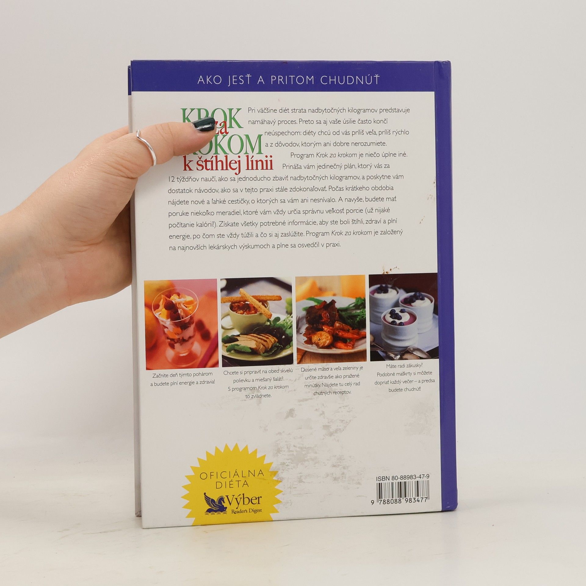 Pri väčšine diét strata nadbytočných kilogramov predstavuje namáhavý proces. Preto sa aj vaše úsilie často končí neúspechom: diéty chcú od vás príliš veľa, príliš rýchlo a z dôvodov, ktorým ani dobre nerozumiete. Program Krok za krokom je niečo úplne iné. Prináša vám jedinečný plán, ktorý vás za 12 týždňov naučí, ako sa jednoducho zbaviť nadbytočných kilogramov, a poskytne vám dostatok návodov, ako sa v tejto praxi stále zdokonaľovať. Počas krátkeho obdobia nájdete nové a ľahké cestičky, o ktorých sa vám ani nesnívalo. A navyše budete mať poruke niekoľko meradiel, ktoré vám vždy určia správnu veľkosť porcie /už nijaké počítanie kalórií/. Získate všetky potrebné informácie, aby ste boli štíhli, zdraví a plní energie, po čom ste vždy túžili a čo si aj zaslúžite. Program Krok za krokom je založený na najnovších lekárskych výskumoch a plne sa osvedčil v praxi.