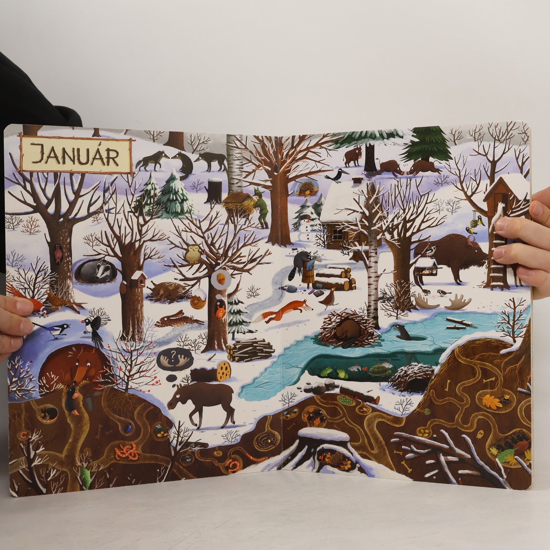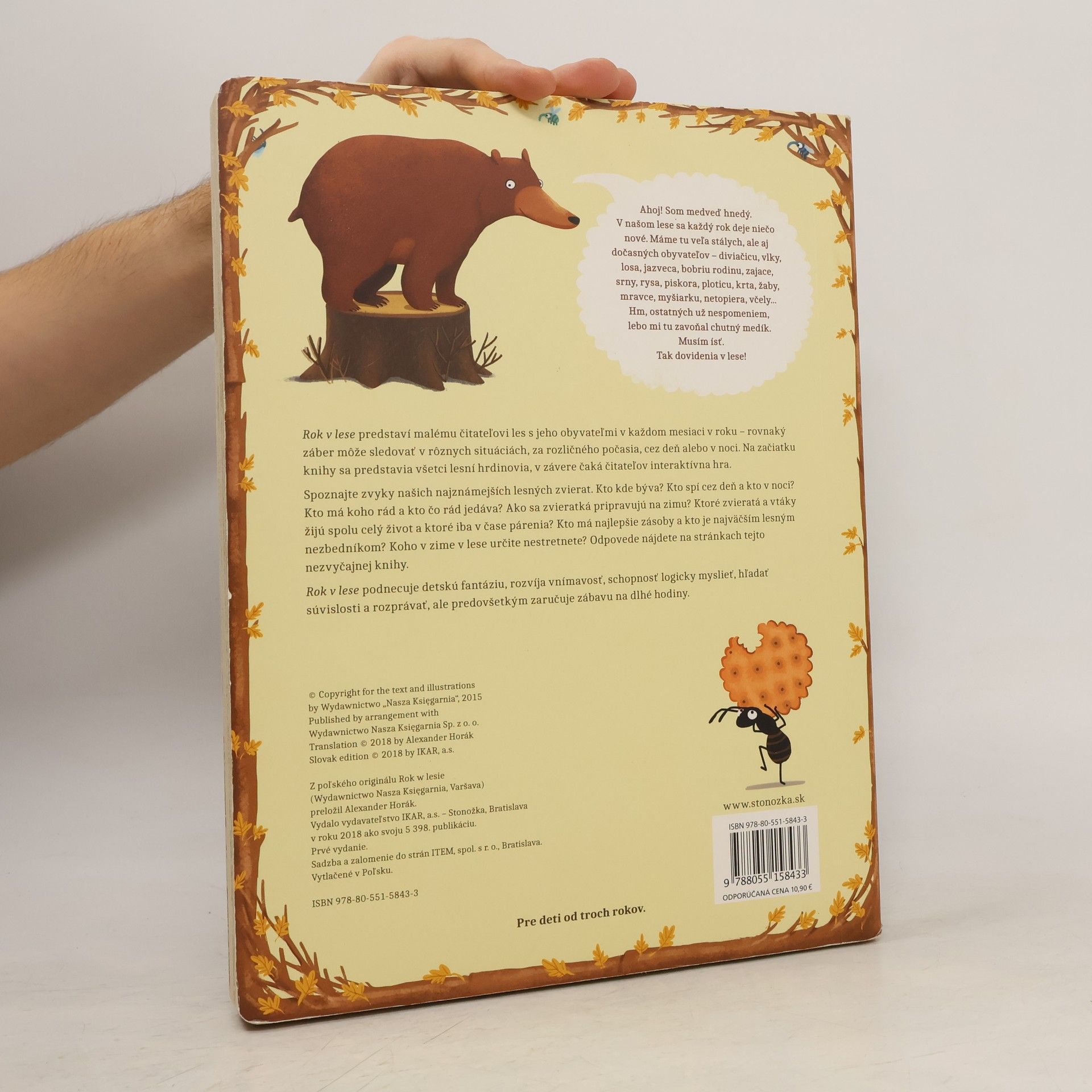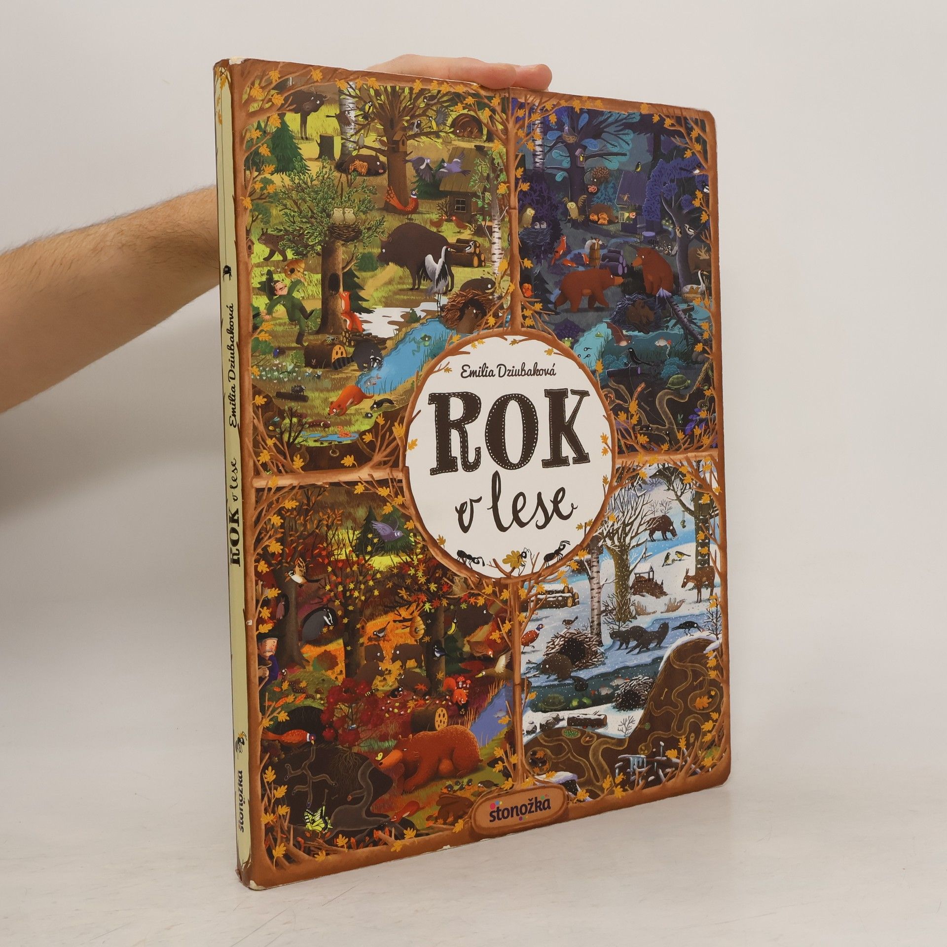 Rok v lese predstaví malému čitateľovi les s jeho obyvateľmi v každom mesiaci v roku – rovnaký záber môže sledovať v rôznych situáciách, za rozličného počasia, cez deň alebo v noci. Na začiatku knihy sa predstavia všetci lesní hrdinovia, v závere čaká čitateľov interaktívna hra. Spoznajte zvyky našich najznámejších lesných zvierat. Kto kde býva? Kto spí cez deň a kto v noci? Kto má koho rád a kto čo rád jedáva? Ako sa zvieratká pripravujú na zimu? Ktoré zvieratá a vtáky žijú spolu celý život a ktoré iba v čase párenia? Kto má najlepšie zásoby a kto je najväčším lesným nezbedníkom? Koho v zime v lese určite nestretnete? Odpovede nájdete na stránkach tejto nezvyčajnej knihy. Rok v lese podnecuje detskú fantáziu, rozvíja vnímavosť, schopnosť logicky myslieť a hľadať súvislosti a rozprávať, ale predovšetkým zaručuje zábavu na dlhé hodiny. Pre deti od troch rokov.