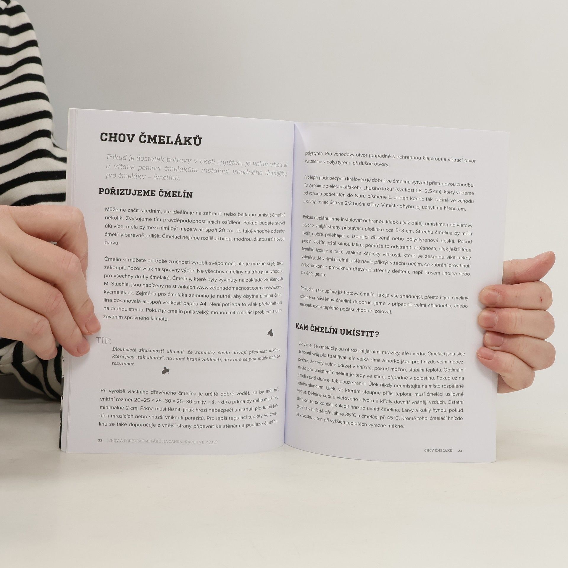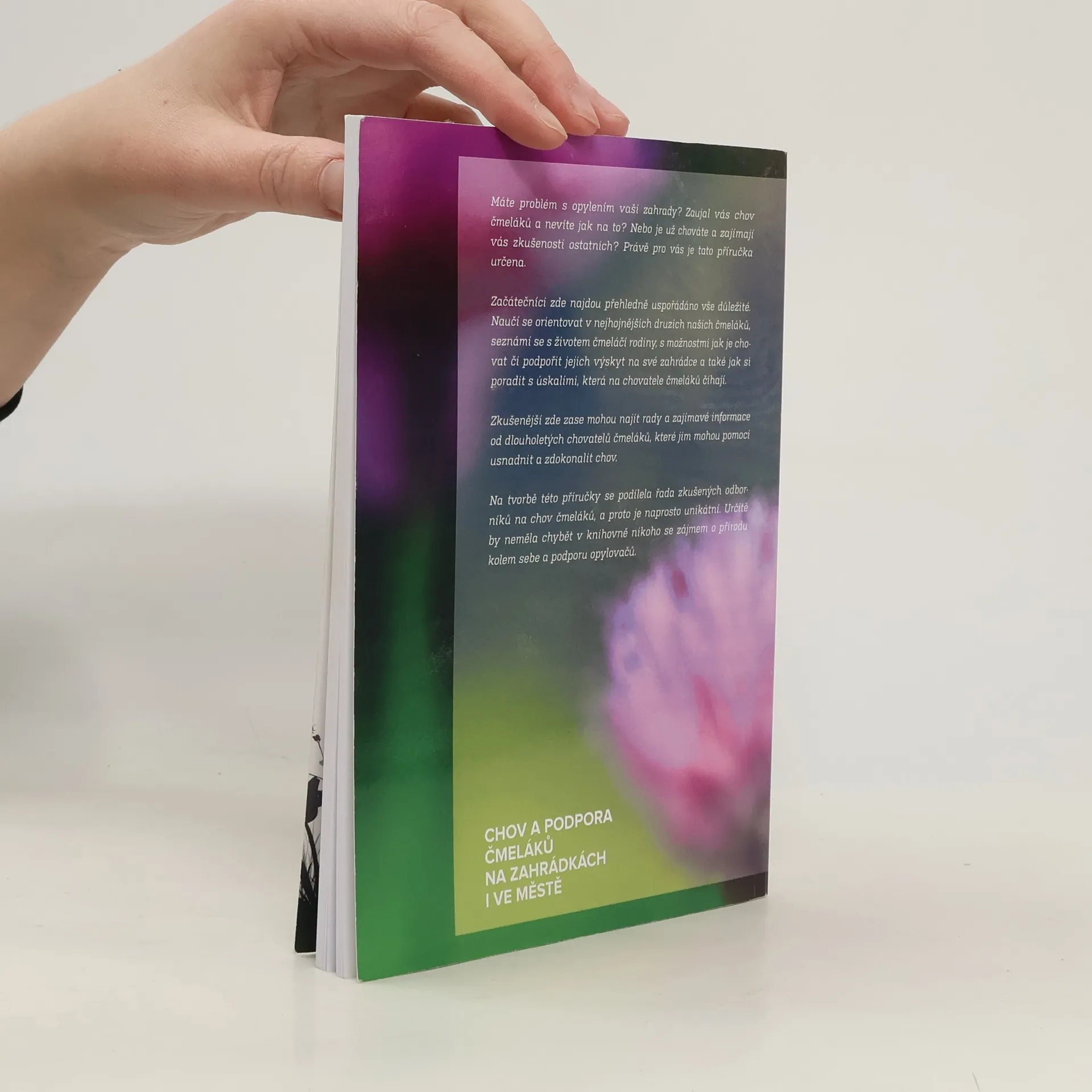 Příručka vá seznámí se základními informacemi o čmelácích a jejich chovu i s osvědčenými tipy zkušených chovatelů čmeláků. Dozvíte se jaké existují druhy čmeláků, jaký je životní cyklus čmeláka a jak to chodí v jeho hnízdě, kam připravit čmelín, jak nalákat nebo odchytit královnu, jak čmeláky pozorovat, jak je chránit před škůdci a jak připravit čmelín na další sezónu. Na závěr se dozvíte také pár slov o včelách samotářkách.