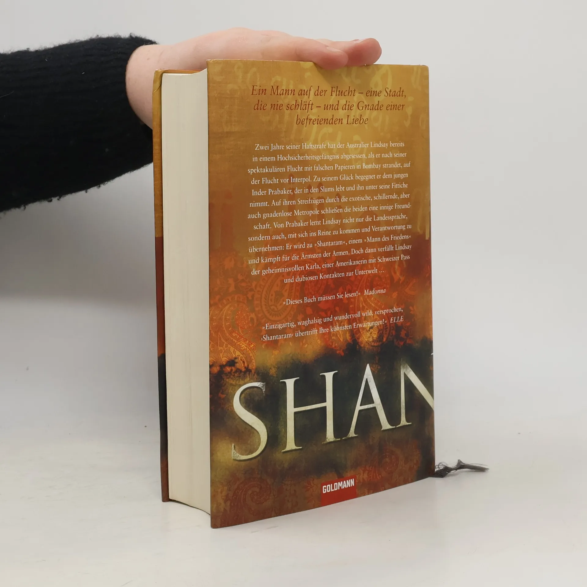 Ein Mann auf der Flucht – Eine Stadt, die nie schläft – Und die Gnade einer befreienden Liebe Shantaram erzählt in fiktionaler Form die Geschichte von Roberts’ eigenem Leben: Als der Australier Lindsay in Bombay strandet, hat er zwei Jahre seiner Gefängnisstrafe abgesessen und ist auf der Flucht vor Interpol. Zu seinem Glück begegnet er dem jungen Inder Prabaker, der ihn unter seine Fittiche nimmt. Auf ihren Streifzügen durch die exotische Metropole schließen die beiden eine innige Freundschaft. Von Prabaker lernt Lindsay nicht nur die Landessprache, sondern auch, mit sich ins Reine zu kommen: Er wird zu „Shantaram“, einem „Mann des Friedens“ und kämpft für die Ärmsten der Armen. Doch dann verfällt Lindsay der geheimnisvollen Karla, einer Deutsch-Amerikanerin mit dubiosen Kontakten zur Unterwelt … Ein Roman, so leidenschaftlich wie der Herzschlag Indiens, voller Wahrheit und Poesie.