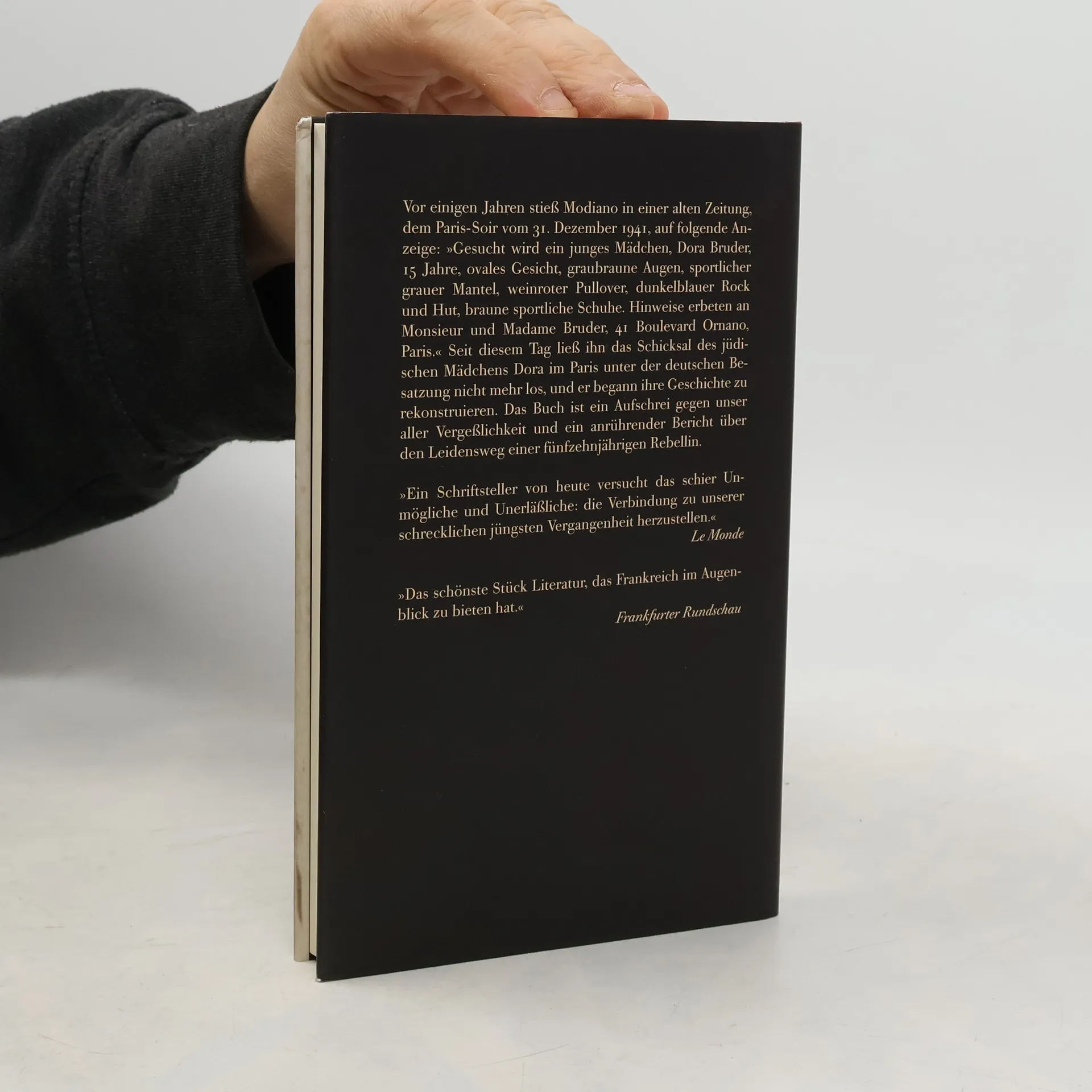 Wer war Dora Bruder? Eine Zeitungsanzeige im Paris Soir vom 31. Dezember 1941 läßt Patrick Modiano nicht mehr los: »Gesucht wird ein junges Mädchen, Dora Bruder, 15 Jahre, ovales Gesicht, graubraune Augen... « Seit diesem Tag folgt er den Spuren der jungen Jüdin im Paris während der deutschen Besatzung. Von der Flucht aus einem katholischen Mädchenpensionat, über ihre Verhaftung und Deportation nach Drancy bis nach Auschwitz, rekonstruiert Modiano ein zerstörtes Leben. »In seiner moralischen und künstlerischen Eindringlichkeit ist Dora Bruder nicht nur große Literatur, sondern auch ein wichtiges Buch, eine Parabel gegen den Terror damals wie heute.« Günther Freitag, DER STANDARD