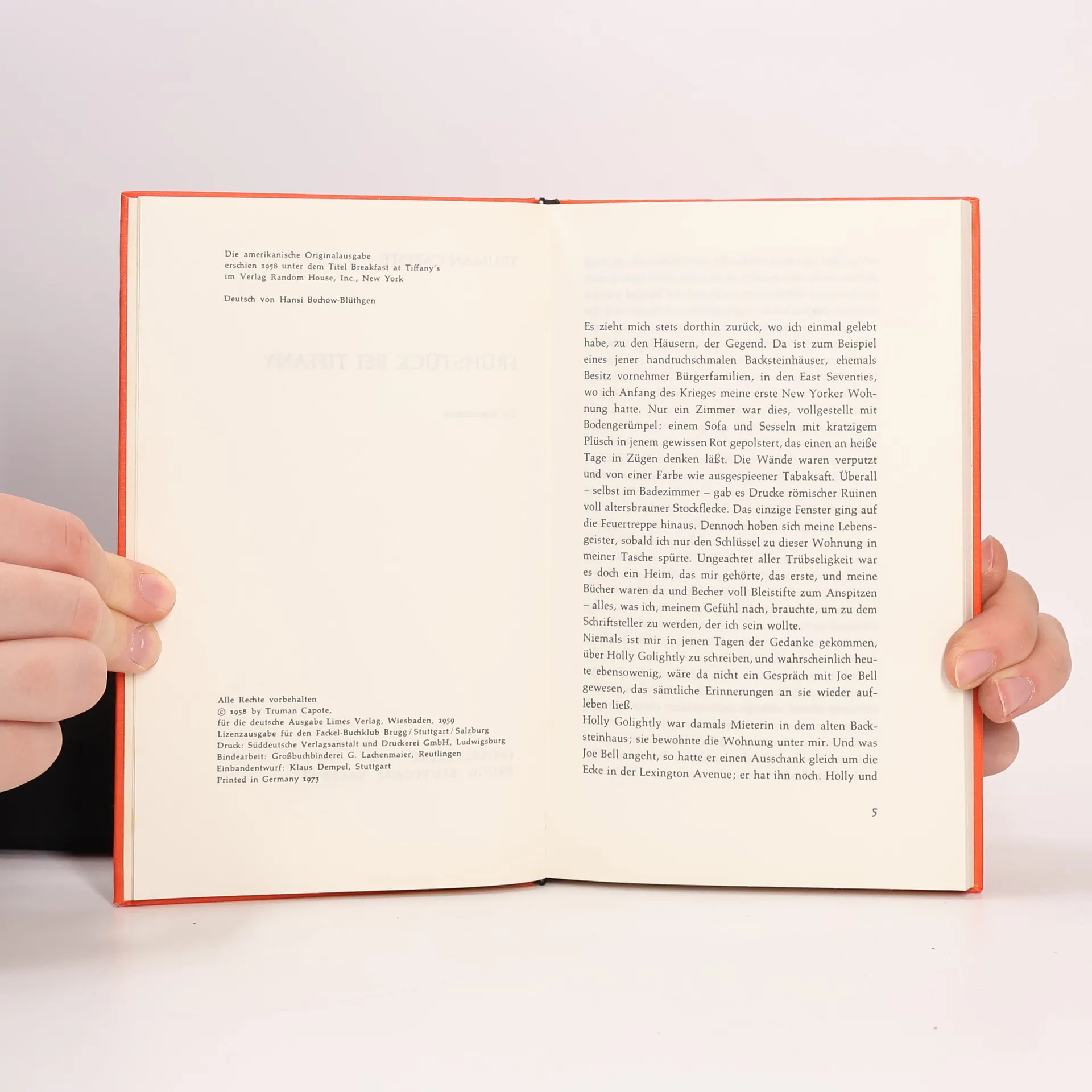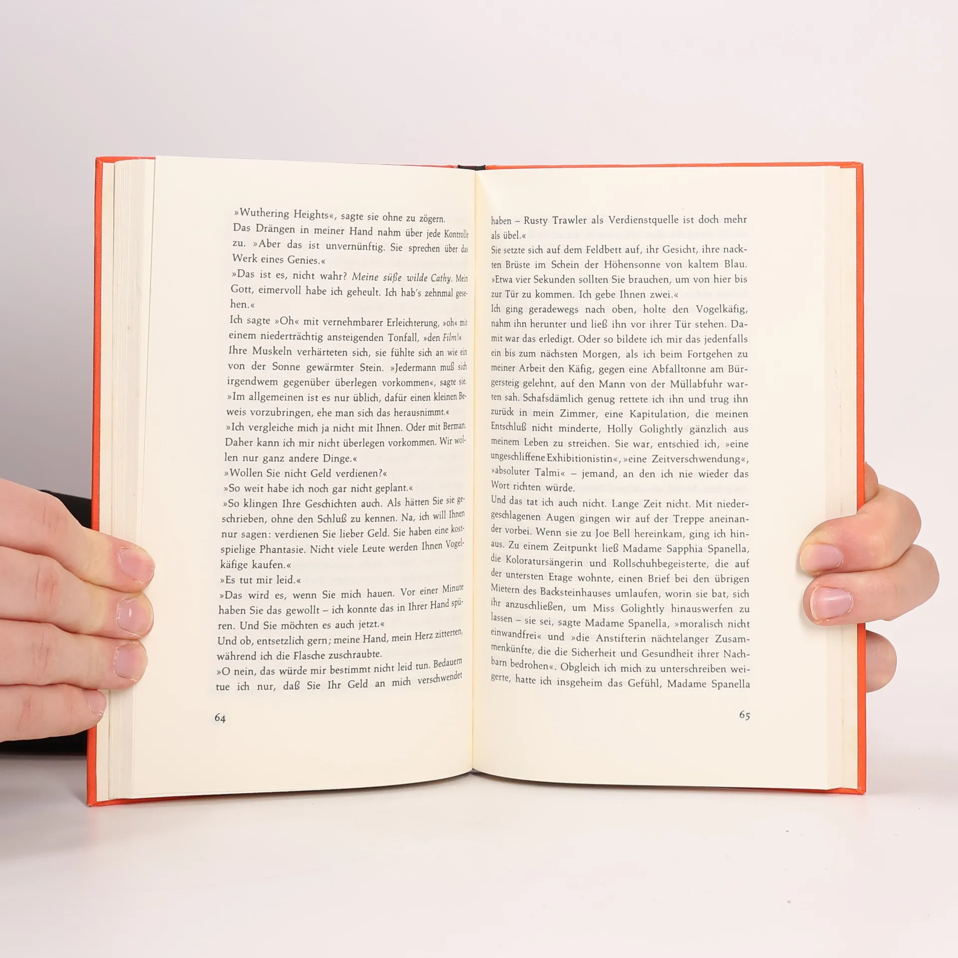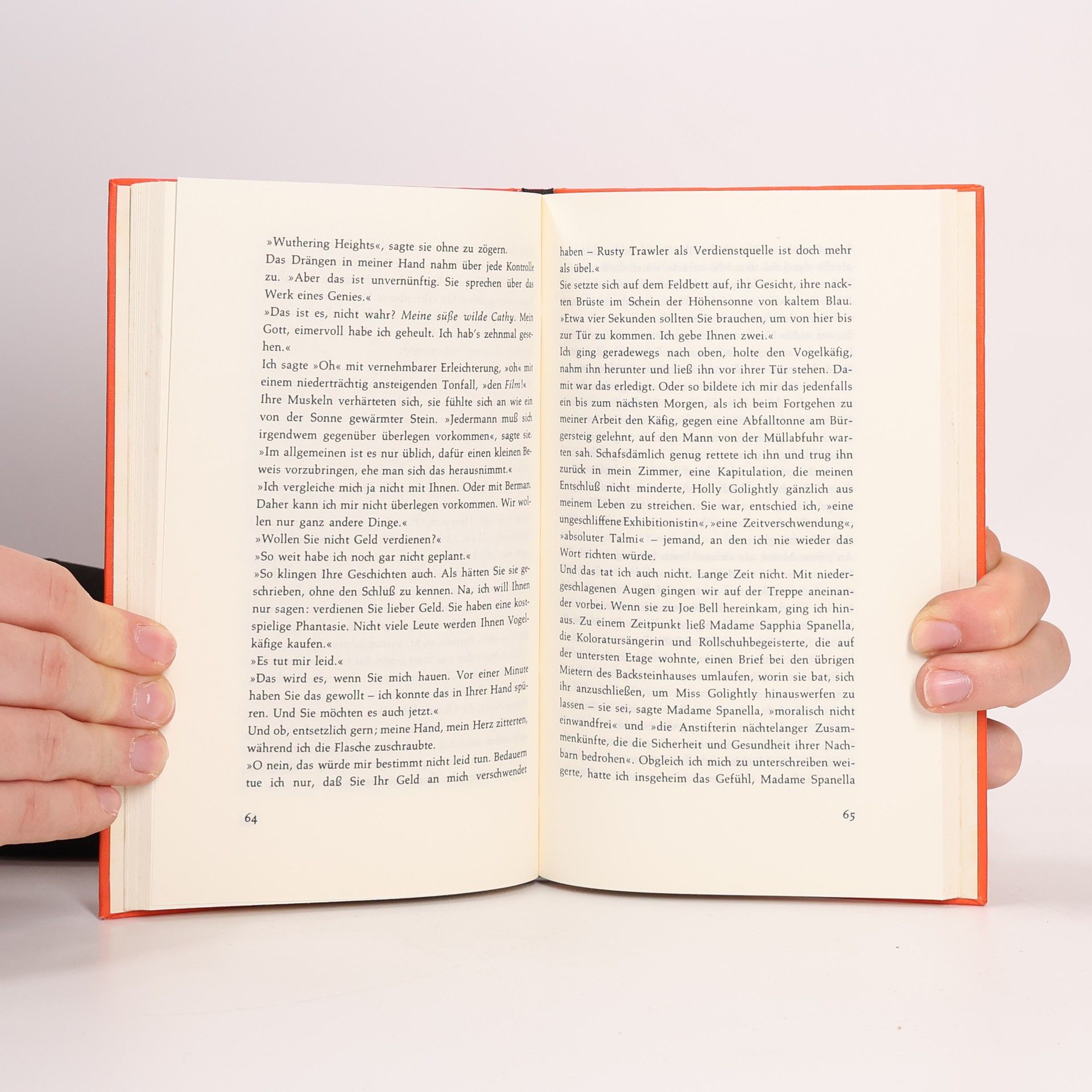 „Bei all ihrer schicken Magerkeit strahlte sie eine Haferflocken-Gesundheit aus, eine Seifen- und Zitronen-Reinlichkeit, und auf ihren Wangen lag eine raue Röte. Sie hatte einen großen Mund und eine Stupsnase. Eine Sonnenbrille verbarg ihre Augen. Es war ein Gesicht, das nicht mehr ganz in der Kindheit zuhause war und schon einer Frau gehörte.“ So beschreibt Truman Capote seine unsterbliche Heldin Holly Golightly. Die fast Neunzehnjährige, die voller Lebenshunger vom Land in die große Stadt ausgerissen ist, hat nichts außer ihrer Erscheinung und Ausstrahlung, die sie befähigt, mit Männern zu spielen und sich gewissermaßen aushalten zu lassen. Manchmal, im Partytrubel von New York, glänzt sie unschuldig, doch dann überkommt sie das „rote Elend“, das Gefühl von innerer Leere und Einsamkeit. In solchen Momenten flieht sie zur Fifth Avenue zu Tiffany, wo der Schimmer der Diamanten ihr Sicherheit gibt. Ihr Nachbar, ein junger Schriftsteller, beobachtet ihr aufregendes Leben und liebt ihre Schlagfertigkeit sowie ihre originelle Sprache. Gelegentlich spielt sie Lieder, die an Südstaaten-Nadelwälder oder die Prärie erinnern. Eines Tages ist sie plötzlich verschwunden, und zurück bleibt nur ihr namenloser Kater, auf dessen Suche sich der Erzähler begibt.