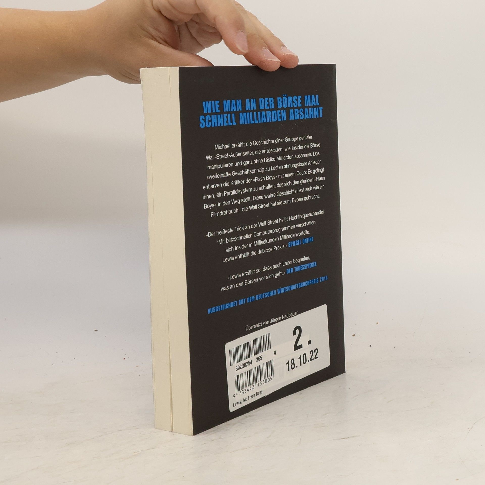Michael Lewis enthüllt in seinem neuesten Buch die Geschichte einer Gruppe genialer Wall-Street-Außenseiter. Sie haben herausgefunden, wie Insider die Börse zu ihrem Vorteil manipulieren und ohne Risiko Milliarden absahnen. Der Entschluss der „Helden“: Sie schaffen ein paralleles System, das sich den raffgierigen „Flash Boys“ in den Weg stellt. Lewis bringt Licht in die dunkelste Ecke des Börsenhandels. Eine Geschichte über den Kampf um Geschwindigkeit auf einem Markt, den zwar keiner sieht, aber der unsere Wirtschaft ernsthaft bedroht. Was sich liest wie ein Filmdrehbuch, hat die Wall Street zum Beben gebracht.