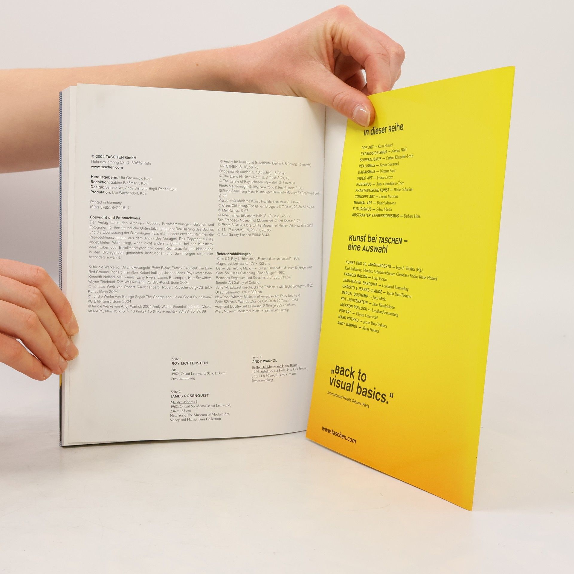 Die grossen Stars der Pop-Art und ihre Kunst sind kompakt in diesem Buch zusammengefasst. Insgesamt 35 der bedeutendsten Werke werden auf je einer Doppelseite präsentiert. Fotos und Kurzbiographien der Künstler ergänzen die Übersicht. Ein umfangreicher Text berichtet einführend über Ereignisse aus Politik, Kultur, Wissenschaft und Sport der 50er und 60er Jahre, die Glanzzeit der Pop-Art. Vervollständigt wird die Auswahl durch einen Ausblick auf die künstlerischen Erben – so bleiben auch Jeff Koons oder Sigmar Polke nicht unerwähnt.