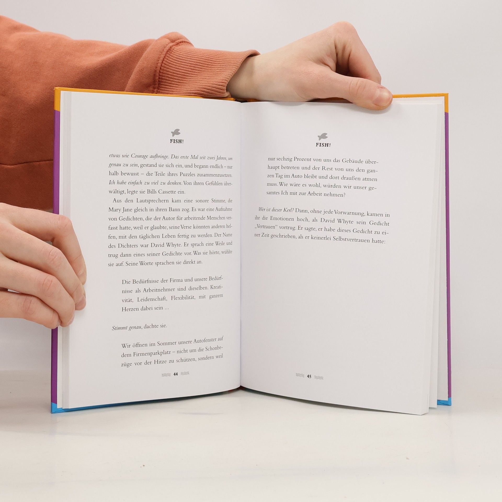 „Fish!™“ verrät das Erfolgsgeheimnis des weltberühmten Pike Place Fischmarkts in Seattle. Die Geschichte zeigt, wie unglaublich wichtig es ist, eine positive Lebenseinstellung zu haben. Das Autorenteam gibt dem Leser vier schlichte Handlungsmaximen mit auf den Weg, die seine Arbeits- und Lebenseinstellung revolutionieren werden. Denn wer beschließt, alles, was er ohnehin tun muss, mit Freude zu tun, motiviert sich selbst und kann ein ganzes Team erfolgreich zu Spitzenleistungen bringen.
