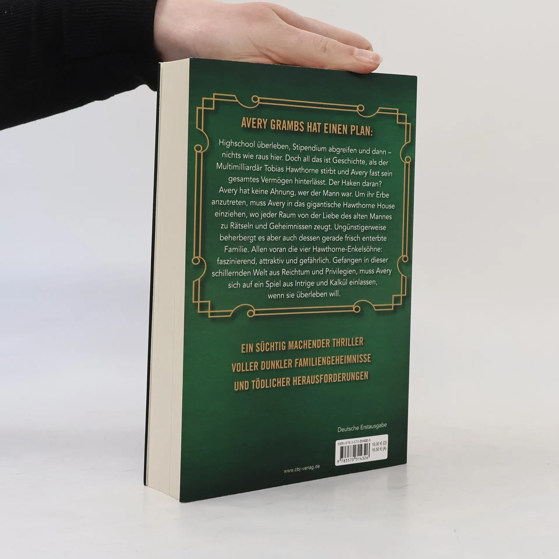 50 Milliarden Dollar – Eine unbekannte Erbin – Vier mörderische Nachkommen. Für alle ab 14 Jahren! Avery Grambs hat einen Plan: Highschool überleben, Stipendium abgreifen und dann – nichts wie raus hier. Doch all das ist Geschichte, als der Multimilliardär Tobias Hawthorne stirbt und Avery fast sein gesamtes Vermögen hinterlässt. Der Haken daran? Avery hat keine Ahnung, wer der Mann war. Um ihr Erbe anzutreten, muss Avery in das gigantische Hawthorne House einziehen, wo jeder Raum von der Liebe des alten Mannes zu Rätseln und Geheimnissen zeugt. Ungünstigerweise beherbergt es aber auch dessen gerade frisch enterbte Familie. Allen voran die vier Hawthorne-Enkelsöhne: faszinierend, attraktiv und gefährlich. Gefangen in dieser schillernden Welt aus Reichtum und Privilegien, muss Avery sich auf ein Spiel aus Intrige und Kalkül einlassen, wenn sie überleben will. Ein süchtig machender Thriller voller dunkler Familiengeheimnisse und tödlicher Herausforderungen. Die Inheritance-Reihe: The Inheritance Games (Band 1) The Inheritance Games - Das Spiel geht weiter (Band 2) The Inheritance Games - Der letzte Schachzug (Band 3)