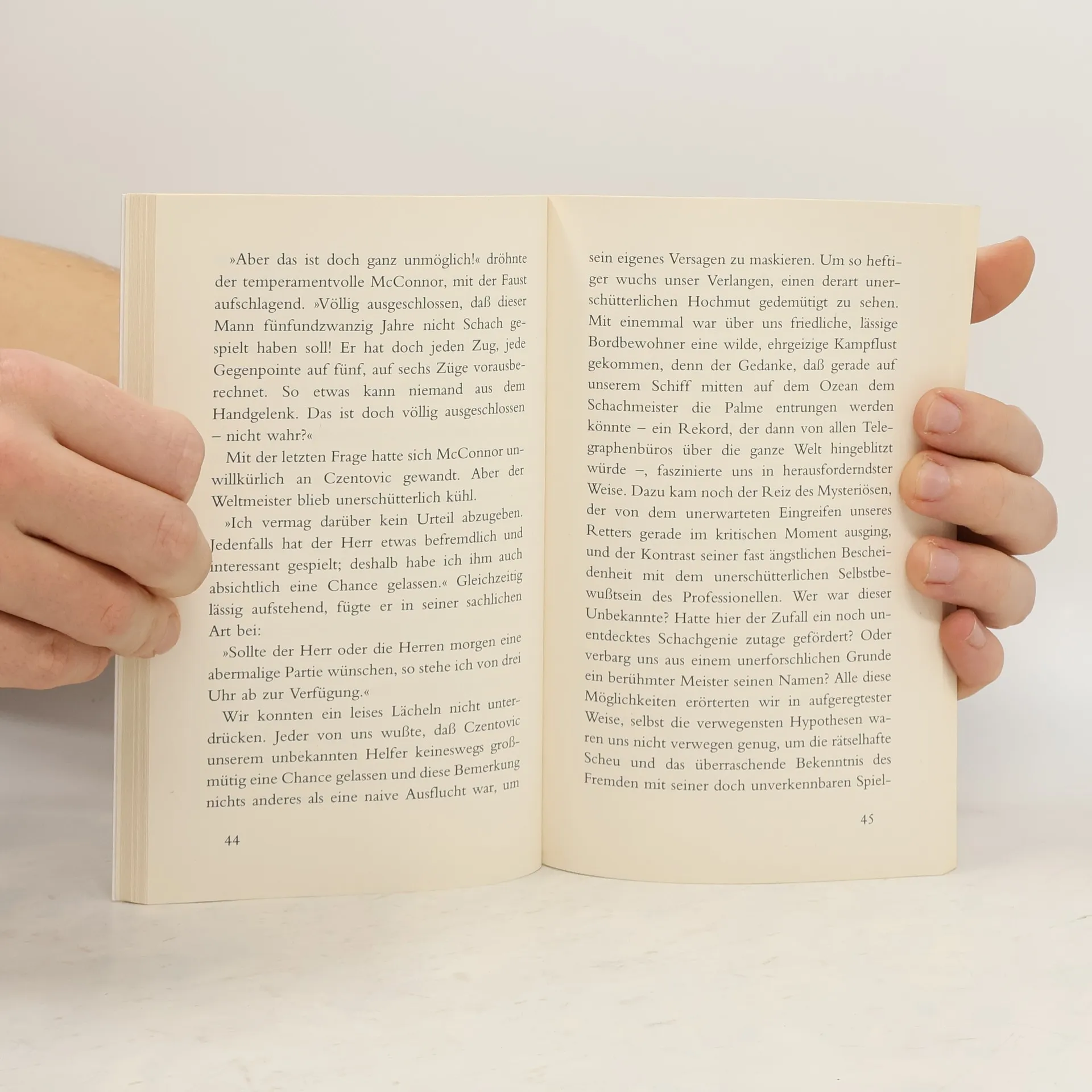 Auf einem Passagierdampfer, der von New York nach Buenos Aires unterwegs ist, fordert ein Millionär gegen Honorar den mit einer Art mechanischer Präzision spielenden Schachweltmeister Mirko Czentovic zu einer Partie heraus. Der mitreisende Dr. B., ein österreichischer Emigrant, greift beratend ein und erreicht so ein Remis für den Herausforderer. Er hat sich, von der Gestapo, die ihn verhaftete, in ein Hotelzimmer gesperrt und von der Außenwelt hermetisch abgeschlossen, monatelang mit dem blinden Spiel von 150 Partien beschäftigt, um sich so seine intellektuelle Widerstandskraft zu erhalten. Durch diese einseitige geistige Anstrengung ergriff ihn ein Nervenfieber, dessentwegen man ihn entließ. Jetzt spielt Dr. B. zum ersten Mal wieder gegen einen tatsächlichen, freilich roboterhaft reagierenden Gegner. Es geht ihm bei dieser Partie lediglich darum, festzustellen, ob sein Tun damals während seiner Haft noch Spiel oder bereits Wahnsinn gewesen ist. Er schlägt den Weltmeister in der ersten Partie souverän, läßt sich aber, eigentlich gegen seinen Willen, auf eine Revanche ein. Während dieser zweiten Partie ergreift ihn wieder das Nervenfieber: er bricht die Partie ab und wird nie wieder ein Schachbrett berühren.