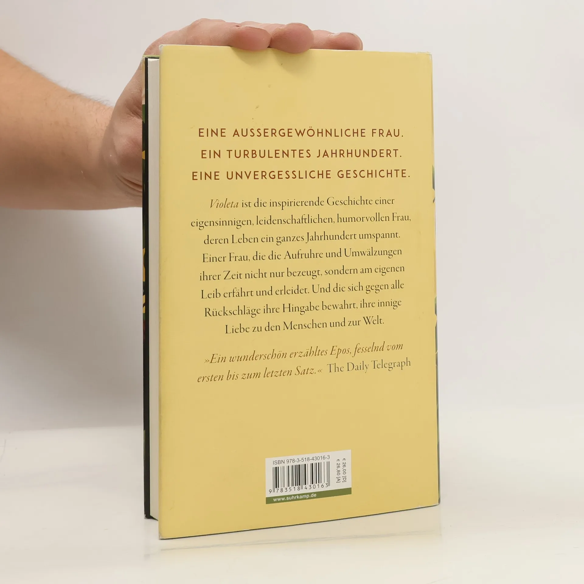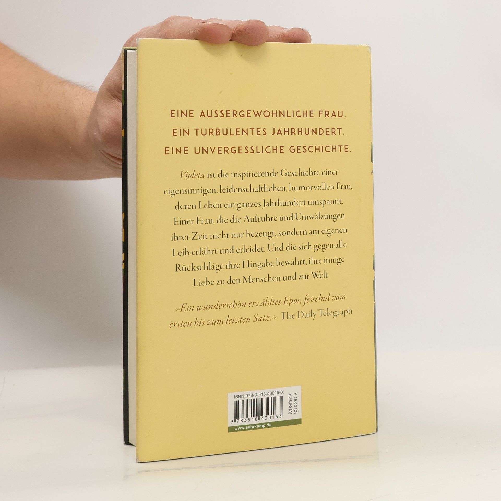 An einem stürmischen Tag des Jahres 1920 kommt sie zur Welt, jüngste Schwester von fünf übermütigen Brüdern, Violeta del Valle. Die Auswirkungen des Krieges sind noch immer spürbar, da verwüstet die Spanische Grippe bereits ihre südamerikanische Heimat. Zum Glück hat der Vater vorgesorgt, die Familie kommt durch, doch schon droht das nächste Unheil, die Weltwirtschaftskrise wird das vornehme Stadtleben, in dem Violeta aufwächst, für immer beenden, die del Valles ziehen sich ins wild-schöne Hinterland zurück. Dort wird Violeta volljährig, und schon steht der erste Verehrer vor der Tür …Violeta erzählt uns selbst ihr Leben, am Ende ihrer Tage schreibt sie ihrem geliebten Enkel einen langen Brief – sie schreibt von ihren halsbrecherischen Affären, den Jahren der Armut, von schrecklichen Verlusten und tiefempfundener Freude, von historischen Vorkommnissen, die ihr Leben geprägt haben: von dem Kampf für die Rechte der Frauen, dem Aufstieg und Fall von Tyrannen und von zwei schrecklichen Pandemien. Violeta ist die inspirierende Geschichte einer eigensinnigen, leidenschaftlichen, humorvollen Frau, deren Leben ein ganzes Jahrhundert umspannt. Einer Frau, die Aufruhr und Umwälzungen ihrer Zeit nicht nur bezeugt, sondern am eigenen Leib erfährt und erleidet. Und die sich gegen alle Rückschläge ihre Hingabe bewahrt, ihre innige Liebe zu den Menschen und zur Welt.