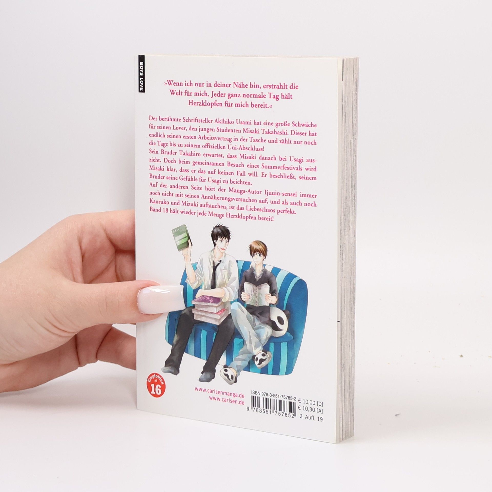 Der romantische Boys-Love-Klassiker - ein Must-Read für alle Yaoi Fans ab 16 Jahren! Der berühmte Schriftsteller Akihiko Usami hat eine große Schwäche für seinen Lover, den jungen Studenten Misaki Takahashi. Dieser hat endlich seinen ersten Arbeitsvertrag in der Tasche und zählt nur noch die Tage bis zu seinem offiziellen Uni-Abschluss! Sein Bruder Takahiro erwartet, dass Misaki danach bei Usagi auszieht. Doch beim gemeinsamen Besuch eines Sommerfestivals wird Misaki klar, dass er das auf keinen Fall will. Er beschließt, seinem Bruder seine Gefühle für Usagi zu beichten. Auf der anderen Seite hört der Manga-Autor Ijuuin-sensei immer noch nicht mit seinen Annäherungsversuchen auf, und als auch noch Kaoruko und Mizuki auftauchen, ist das Liebeschaos perfekt. Weitere Informationen: - Der Manga zum Anime-Hit auf Crunchyroll - Die Serie gilt als noch nicht abgeschlossen