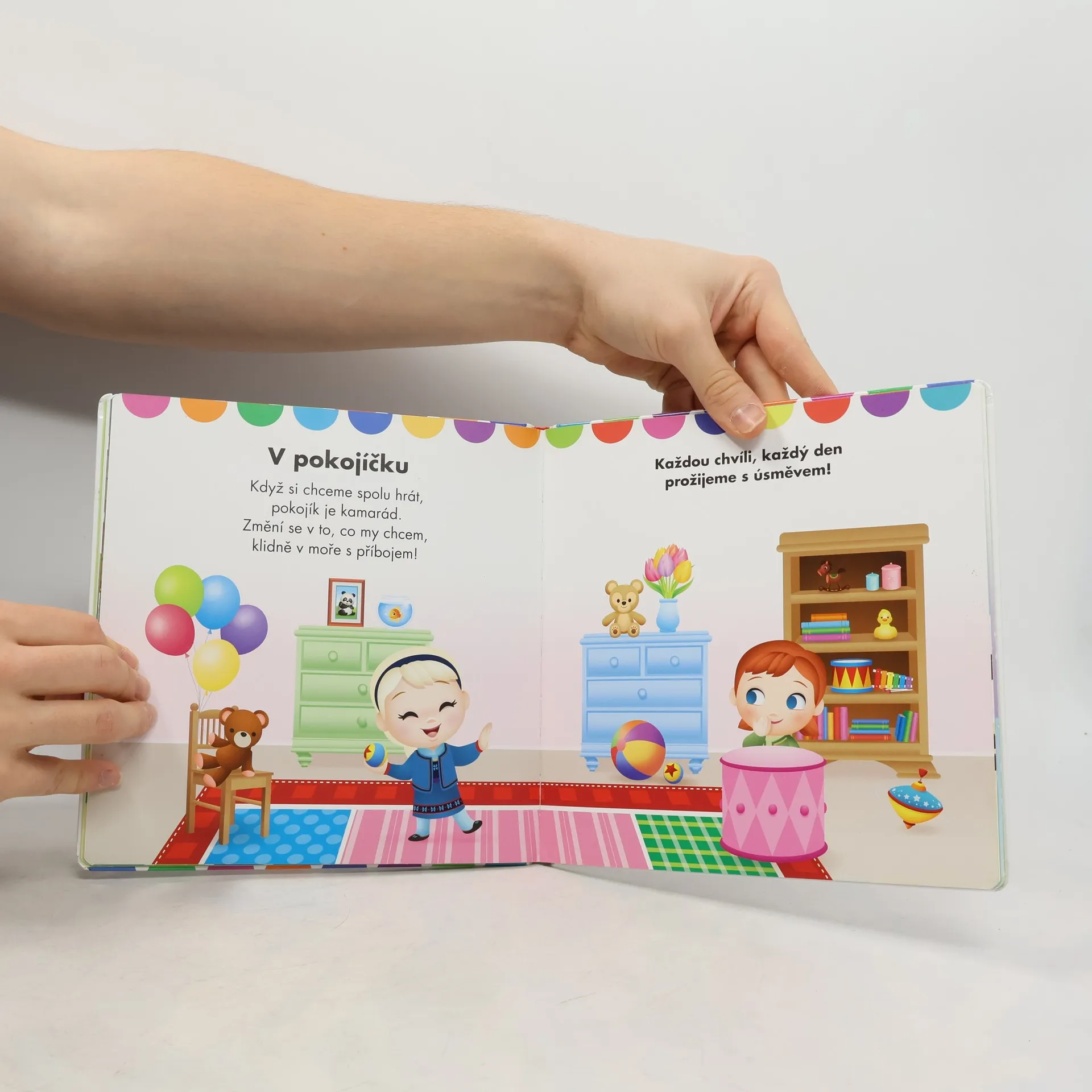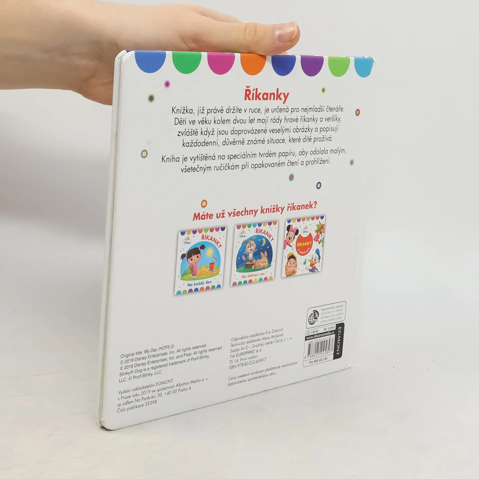 Knížka, již právě držíte v ruce, je určená pro nejmladší čtenáře. Děti ve věku kolem dvou let mají rády hravé říkanky a veršíky, zvláště když jsou provázené veselými obrázky a popisují každodenní, důvěrně známé situace, které dítě prožívá. Kniha je vytištěná na speciálním tvrdém papíru, aby odolala malým, všetečným ručičkám při opakovaném čtení a prohlížení.